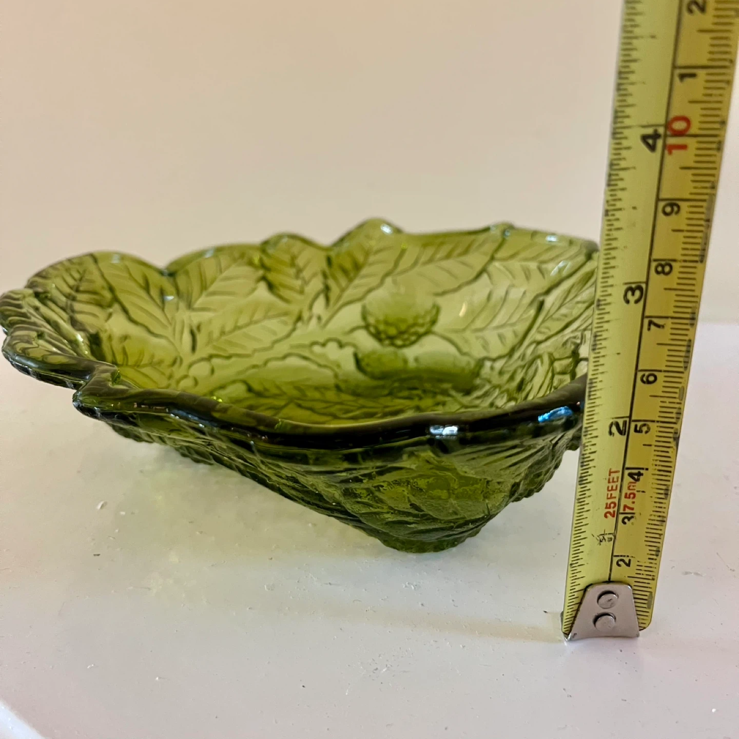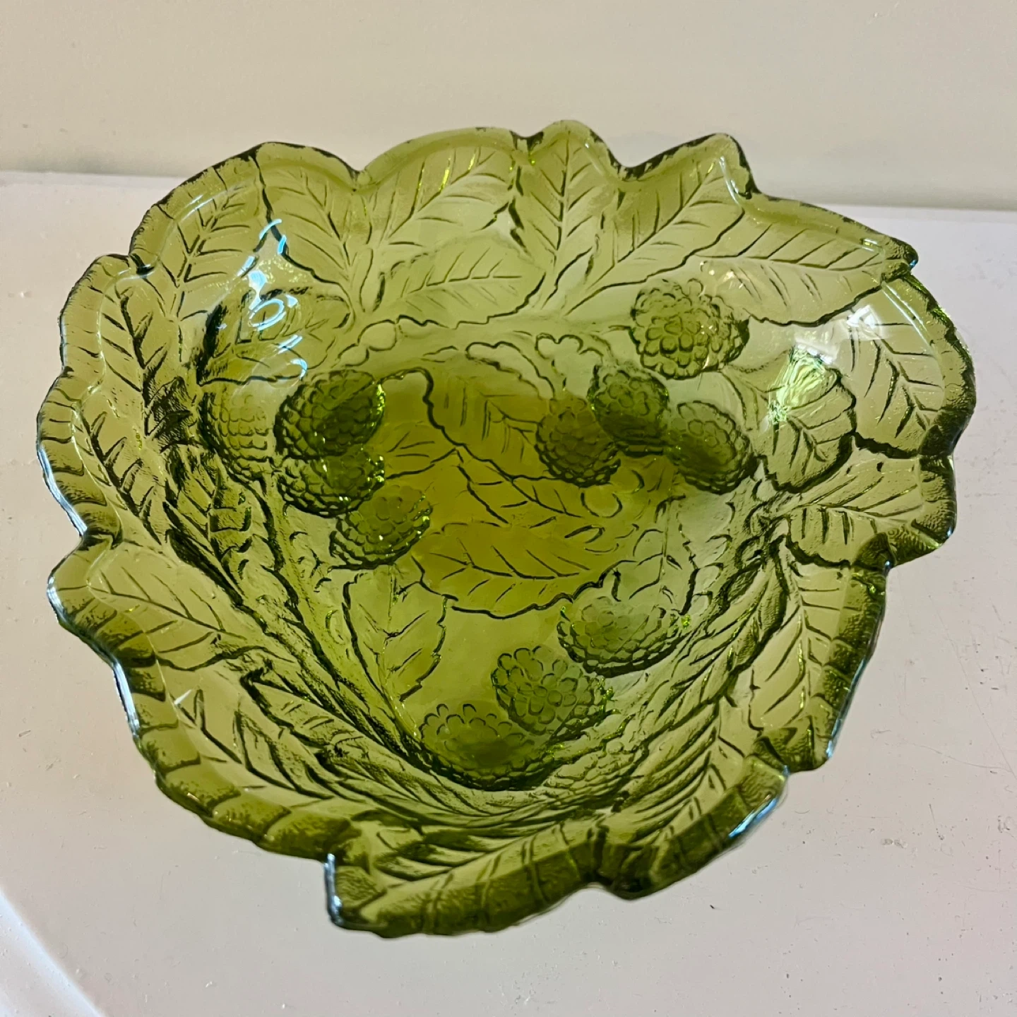 This lovely vintage green Indiana glass bowl features a raised leaf and loganberry pattern, adding a touch of vintage charm to any space.