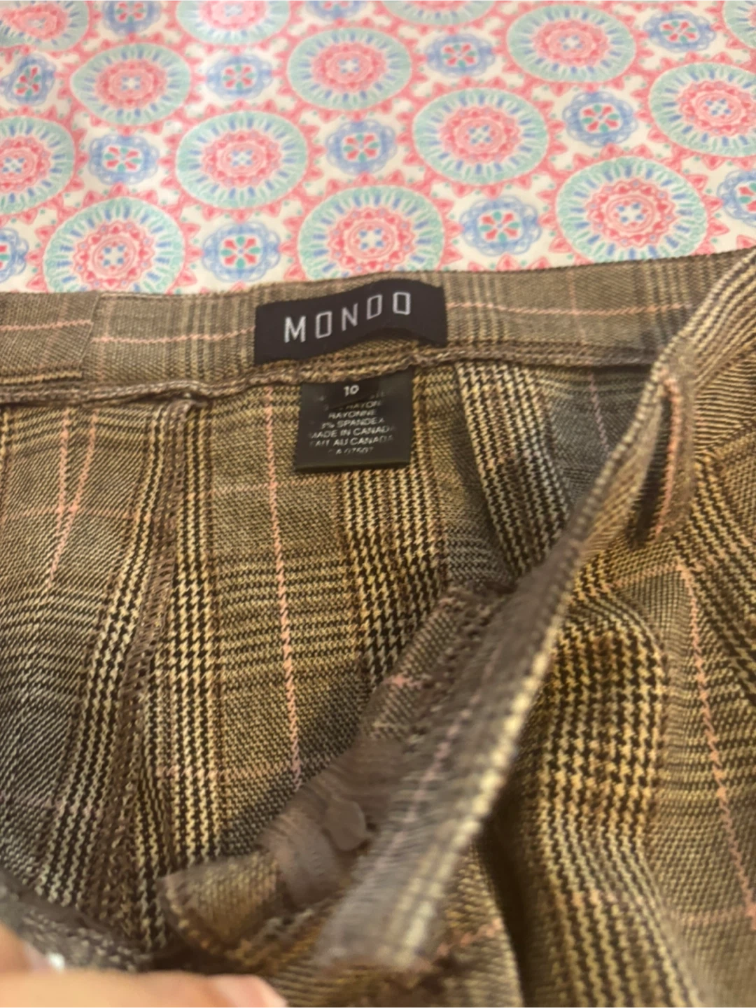Selling a pair of MONDO plaid pants in size 10. They're in great shape and ready for a new home! The material is 71% Rayon, 29% Spandex, made in Canada. A stylish addition to any wardrobe!