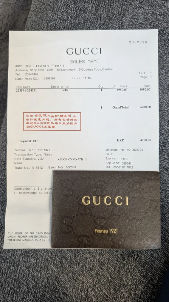 Authentic Gucci leather belt featuring the signature clip-style buckle in gold-tone metal. Purchased directly from the Gucci Square One boutique in Mississauga, and includes the original sales memo (QR code blurred for privacy) as proof of authenticity.