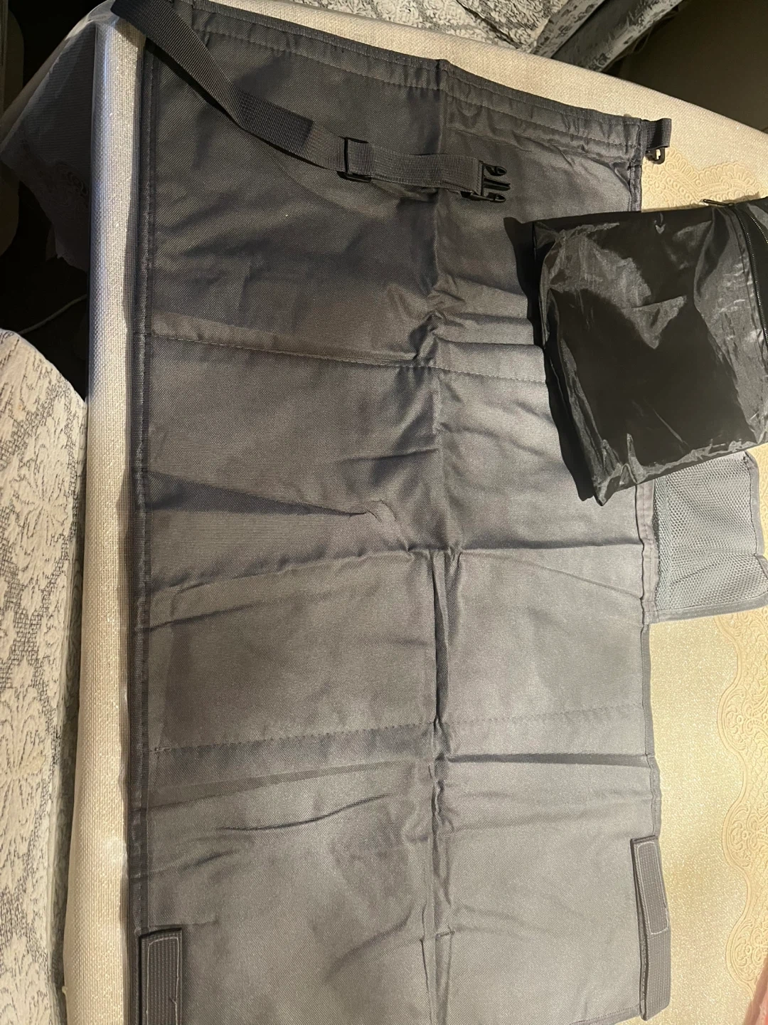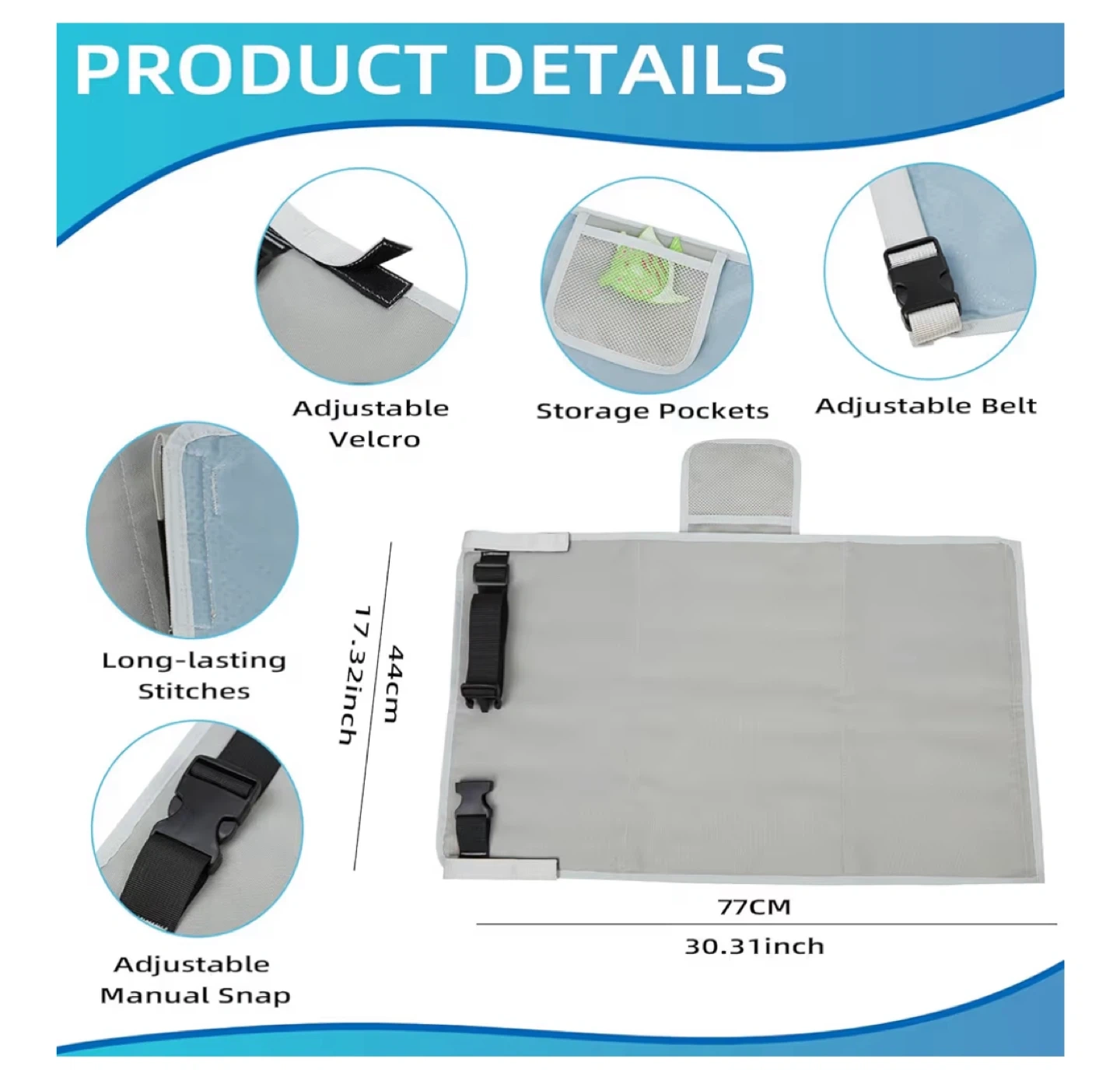 Selling a FOTN toddler airplane bed and seat extender! It's grey and designed for kids to use on airplanes. It helps them sleep and rest during the flight. It's portable and a must-have for air travel with babies. The dimensions are 44cm x 77cm (17.32inch x 30.31inch). It features adjustable Velcro, storage pockets, and an adjustable belt. The material is waterproof and anti-slip, plus it's machine washable!