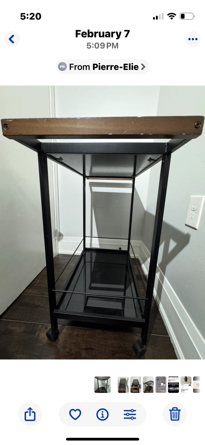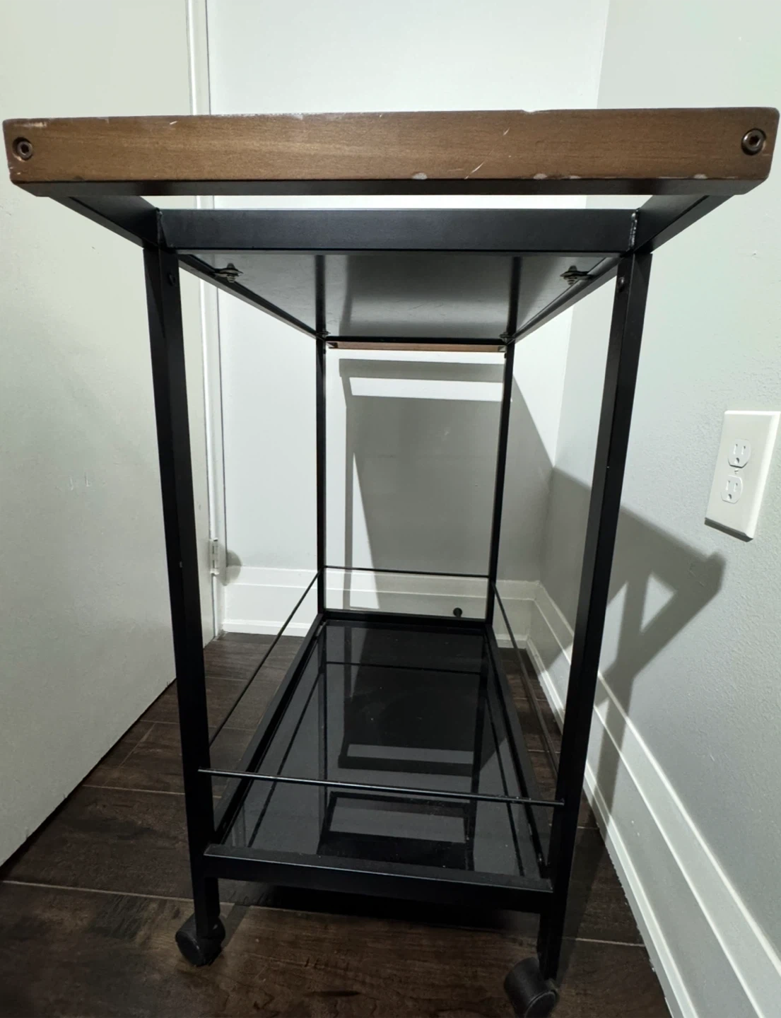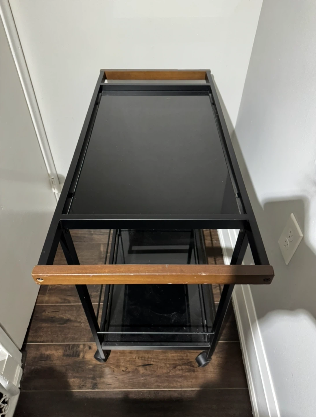 Selling a handy bar cart! It features a sleek black frame with wooden accents on the handles. Perfect for storing drinks and glassware, or for use as a serving cart. Has multiple shelves for storage and easy to move around on its wheels