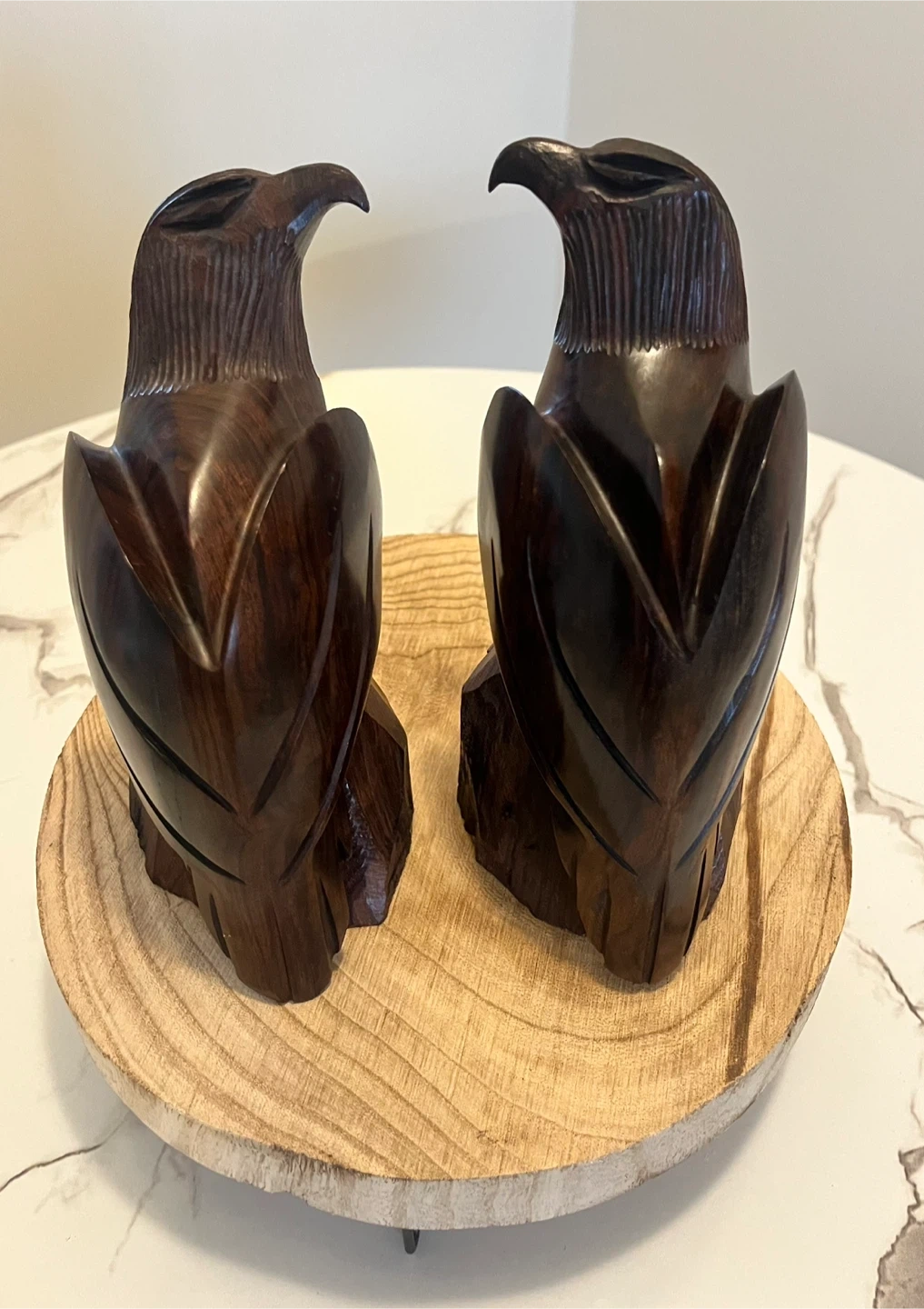 Design: The sculptures are stylized eagle busts, featuring smooth, polished bodies that contrast with the rough, natural finish of the base they are perched on.