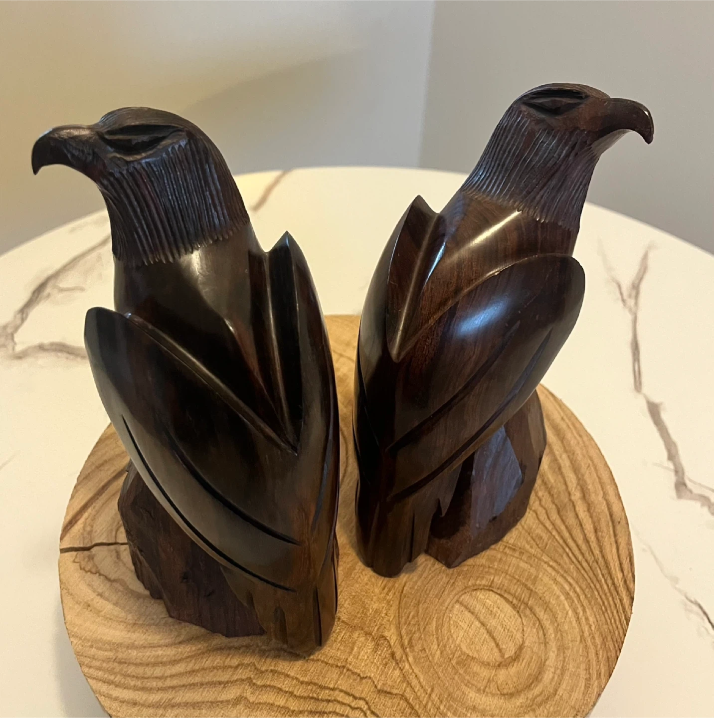 These striking eagle wood carvings are a handsome addition to any study or living room. The unique, dark brown wood grain adds a touch of nature's artistry to your decor. These carvings have been gently owned and are in good condition.