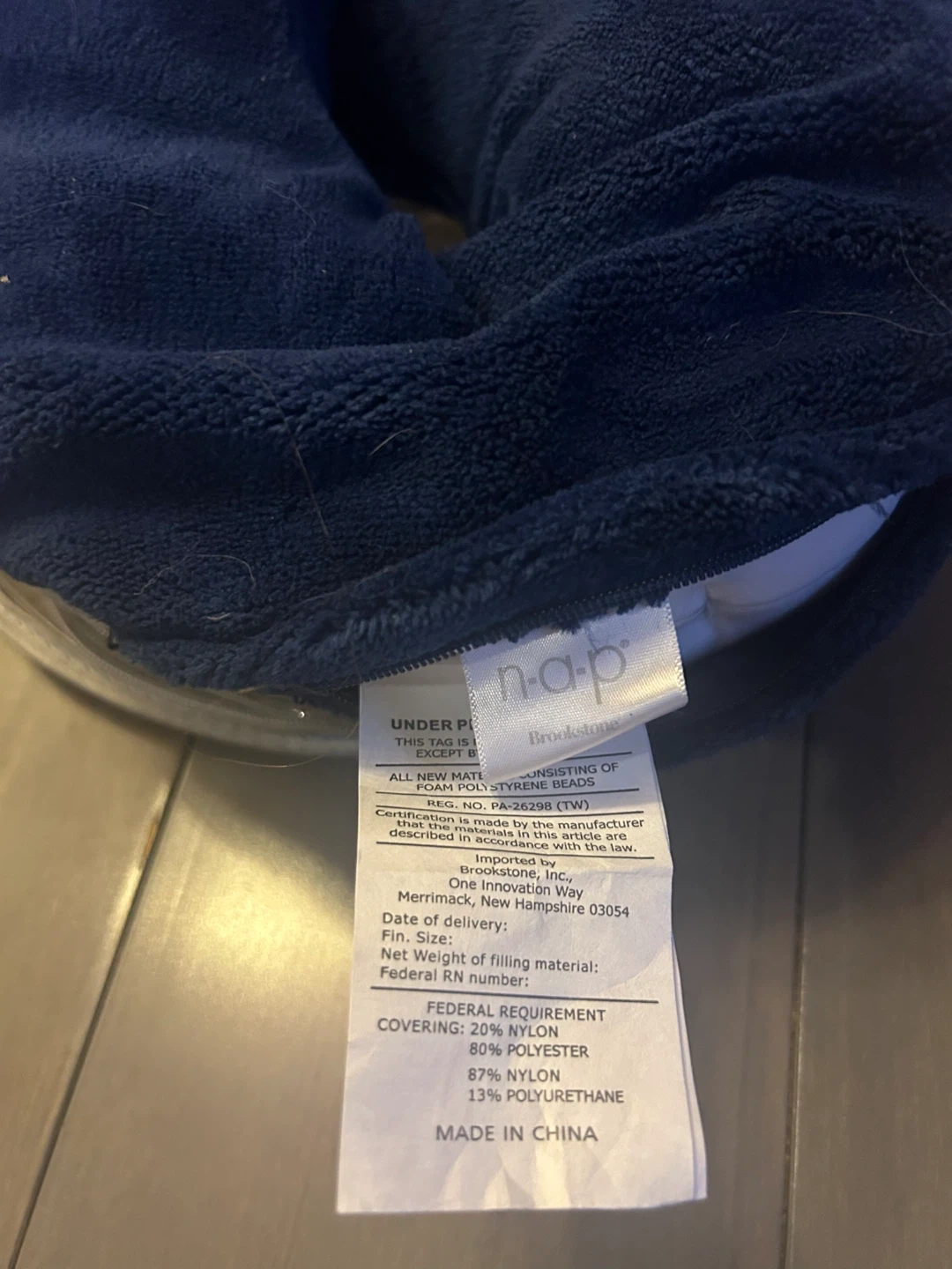 Relax in comfort wherever you go with this Brookstone n-a-p Travel U Pillow, designed to provide neck support during travel. This pillow has a soft, plush feel and is ideal for long trips in cars, trains, or airplanes. It is in good, used condition and ready to accompany you on your next adventure.