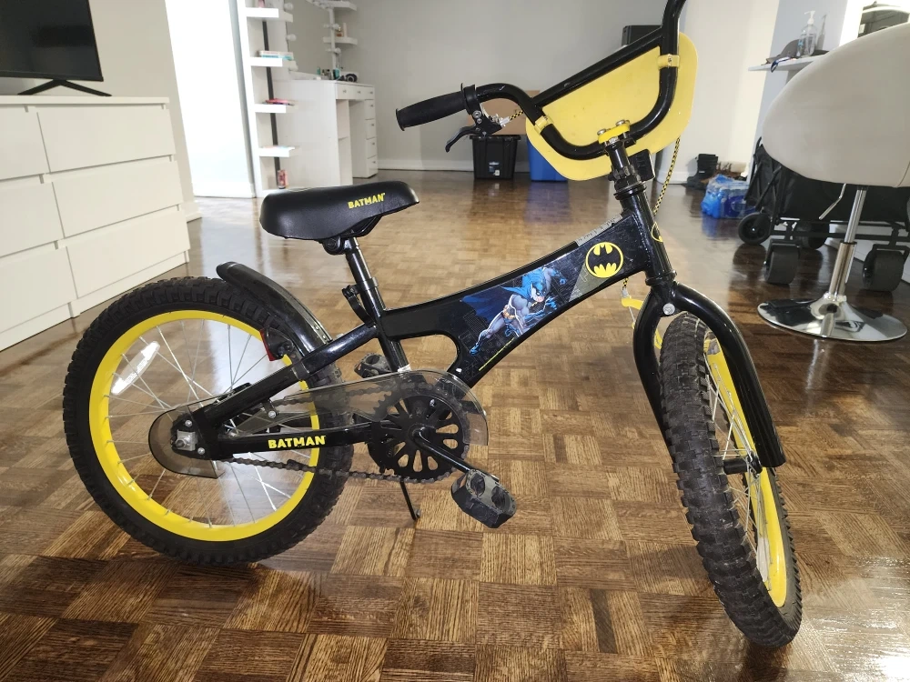 Selling a Batman-themed kids' bike in black and yellow! It's in great shape and ready for a new rider. Perfect for any young Batman fan looking to cruise around the neighbourhood