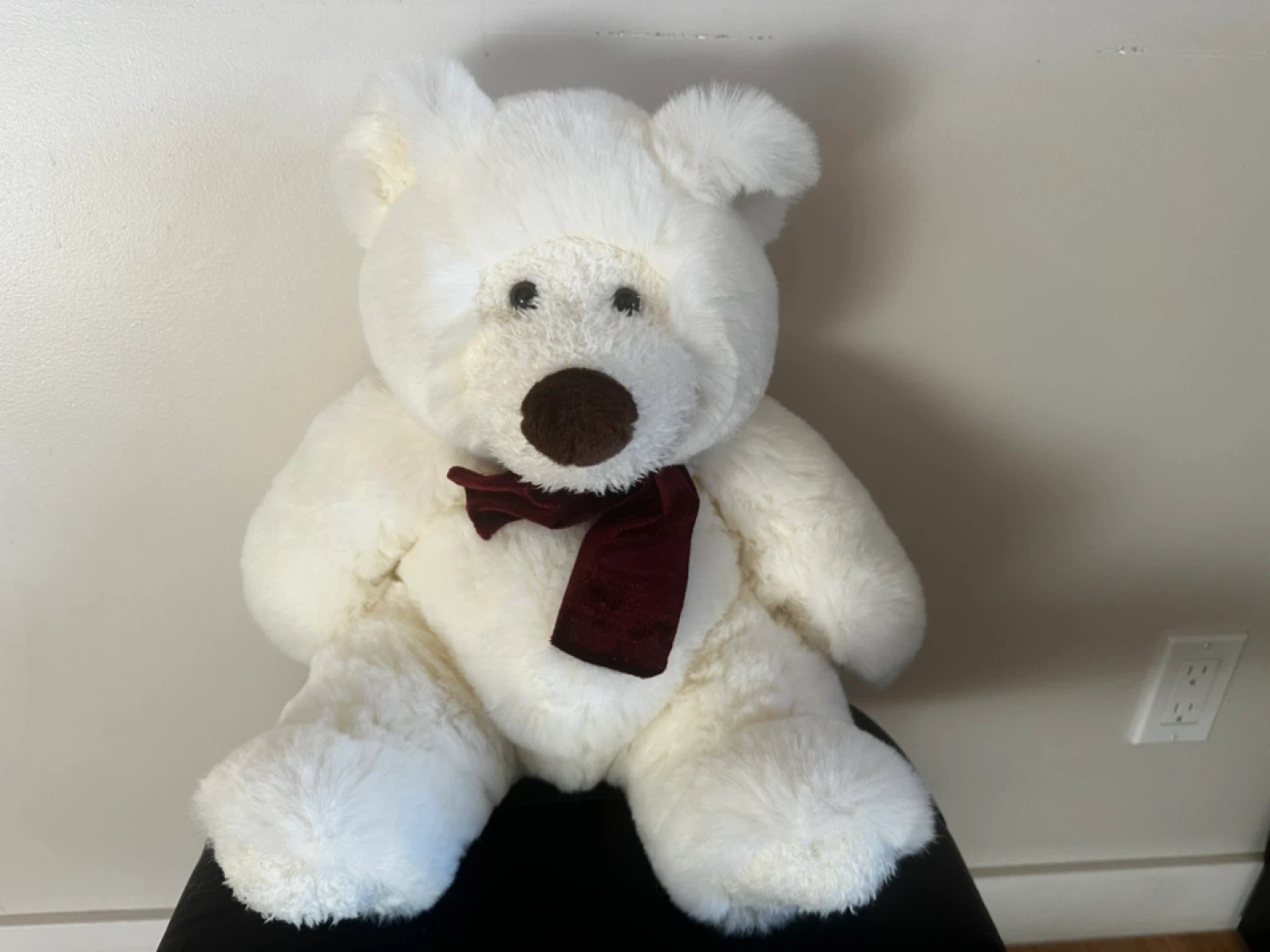 Selling a soft, white plush teddy bear! It's in great condition and ready for a new home. This cuddly bear has a cute dark brown nose and wears a burgundy scarf. Perfect for kids or anyone who loves a good hug! 15 inch high.