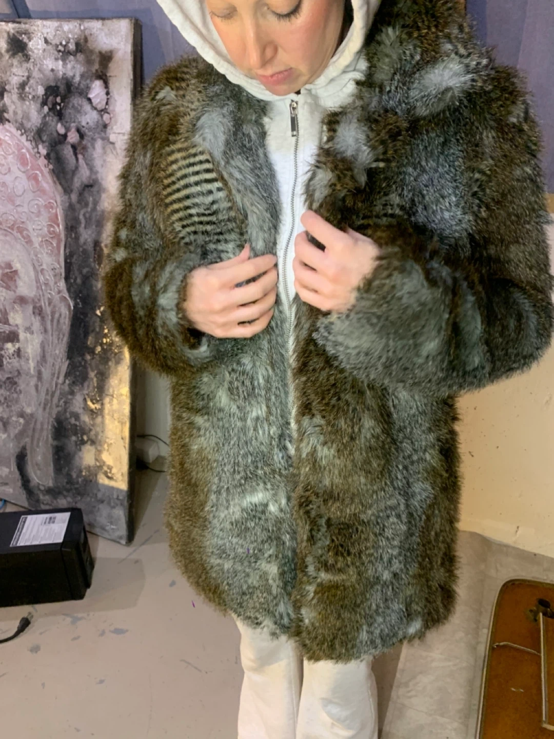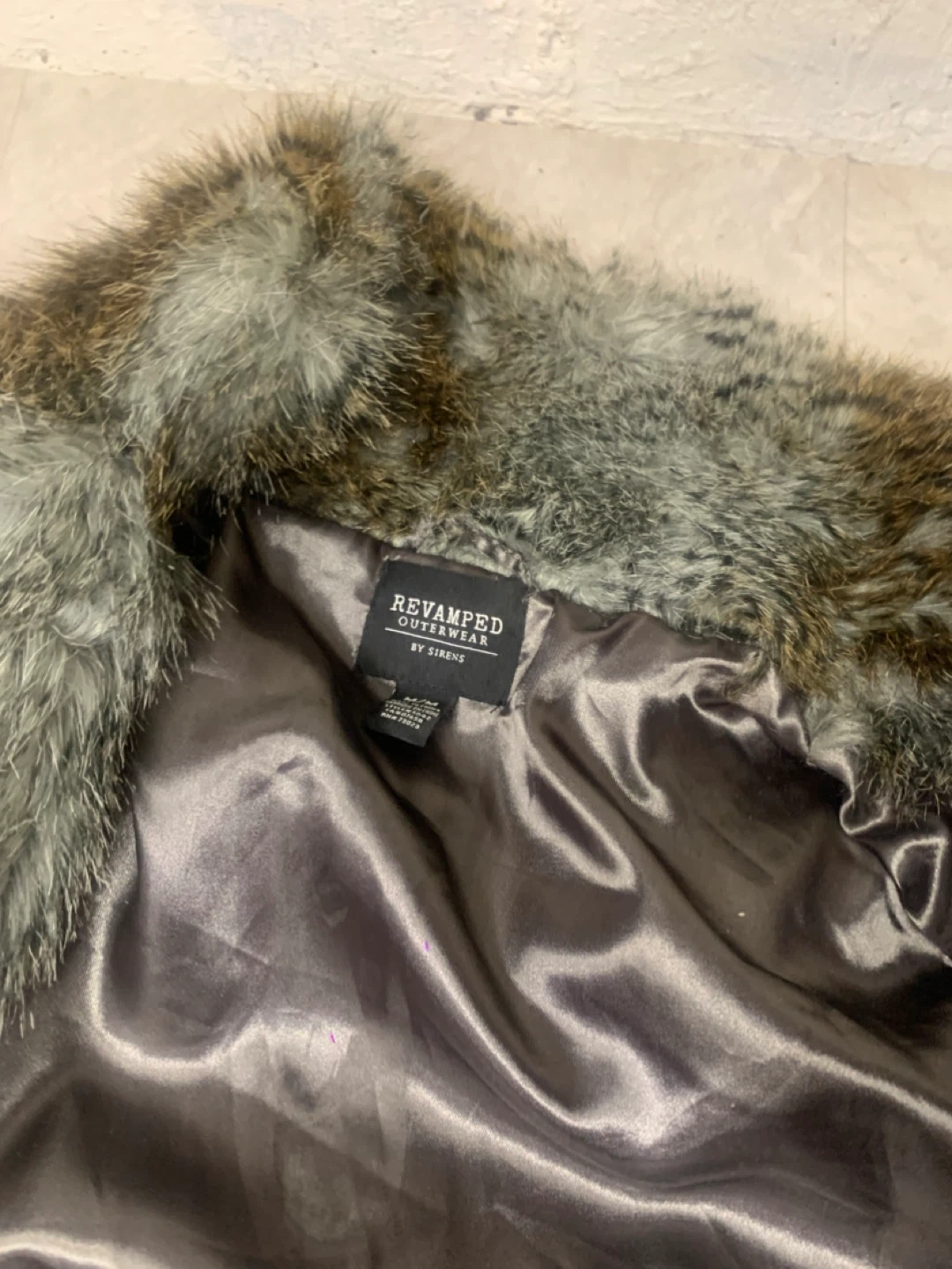 A cozy faux fur coat, perfect for adding some warmth and style to your wardrobe! The coat features a unique mix of textures and colours, giving it a distinctive look. It's in great condition and ready for a new home