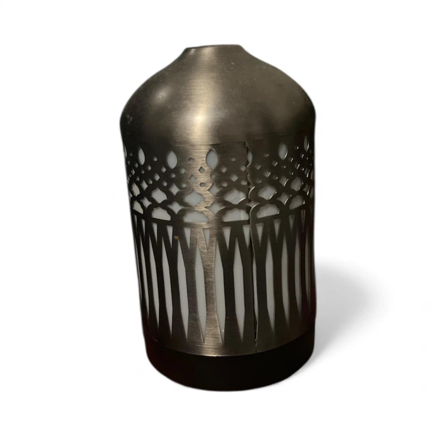 Selling a pre- loved beautiful aroma diffuser. It features a metallic design with intricate cutouts, creating a lovely ambient light when in use. Perfect for adding a touch of elegance and relaxation to any room