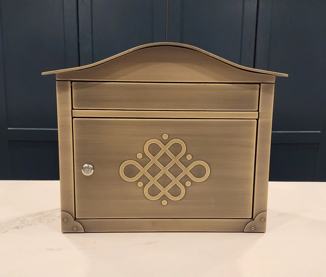 Architectural Mailboxes' Eternity Mailbox. This locking wall mount mailbox with an eternity embossing on the retrieval door offers a beautiful finishing touch to any entry way. The Eternity is constructed of 20 and 24 gauge stainless steel and is finished in a brushed copper plating. Mailbox is equipped with a stainless steel scalped cam lock with a locked/unlocked indicator and two keys. Includes mounting hardware and is pre-drilled for easy installation. Stainless Steel with Antique Copper Plated Finish Can accept magazines, priority mail envelopes and mail bundles Equipped with stainless steel lock and two keys Pre-drilled for installation ease Includes hardware Original Price $227
