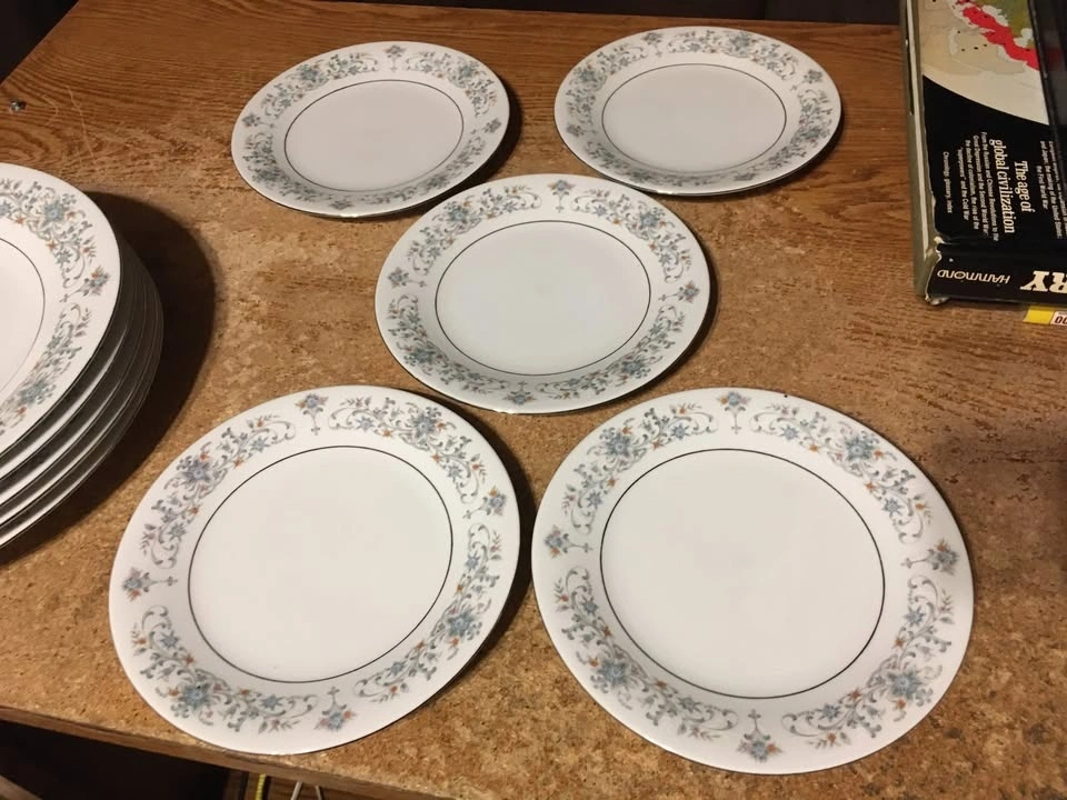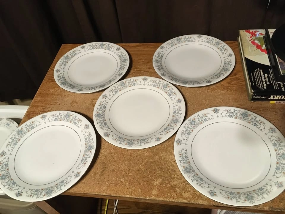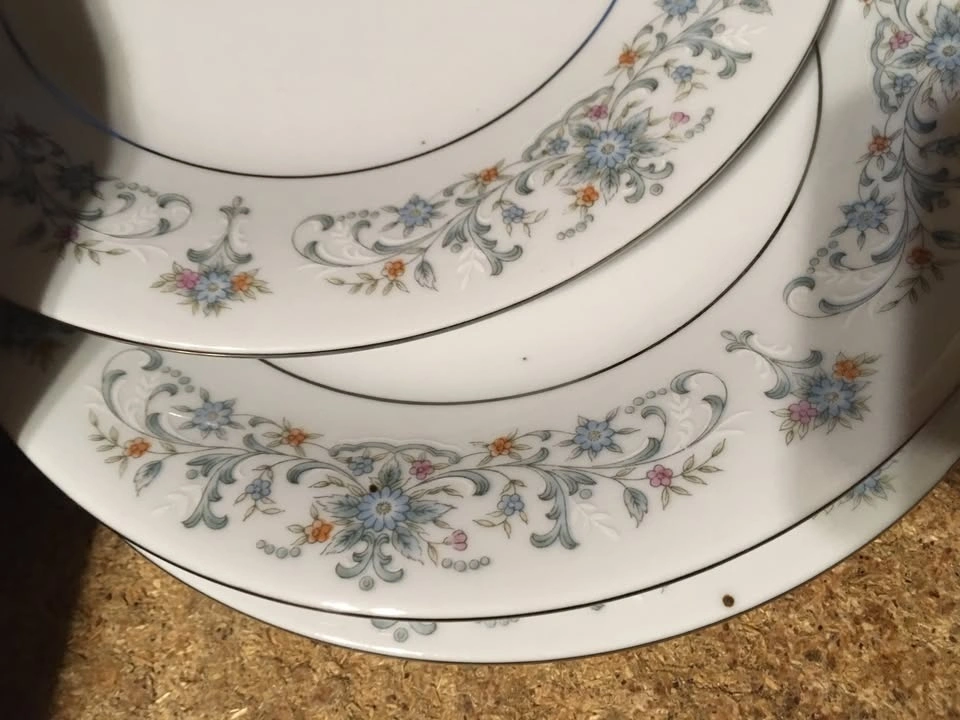 Good condition, floral pattern silver blue multicolor, a few have dots/marks on them, shown on the last picture. Cash only, pick up at house.