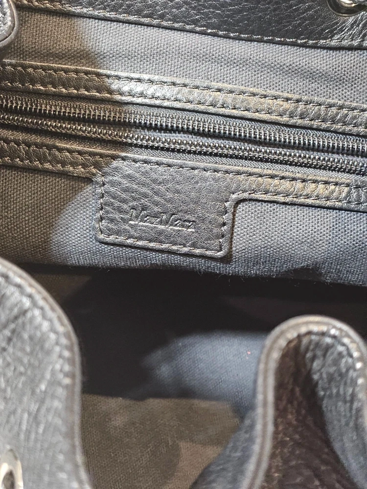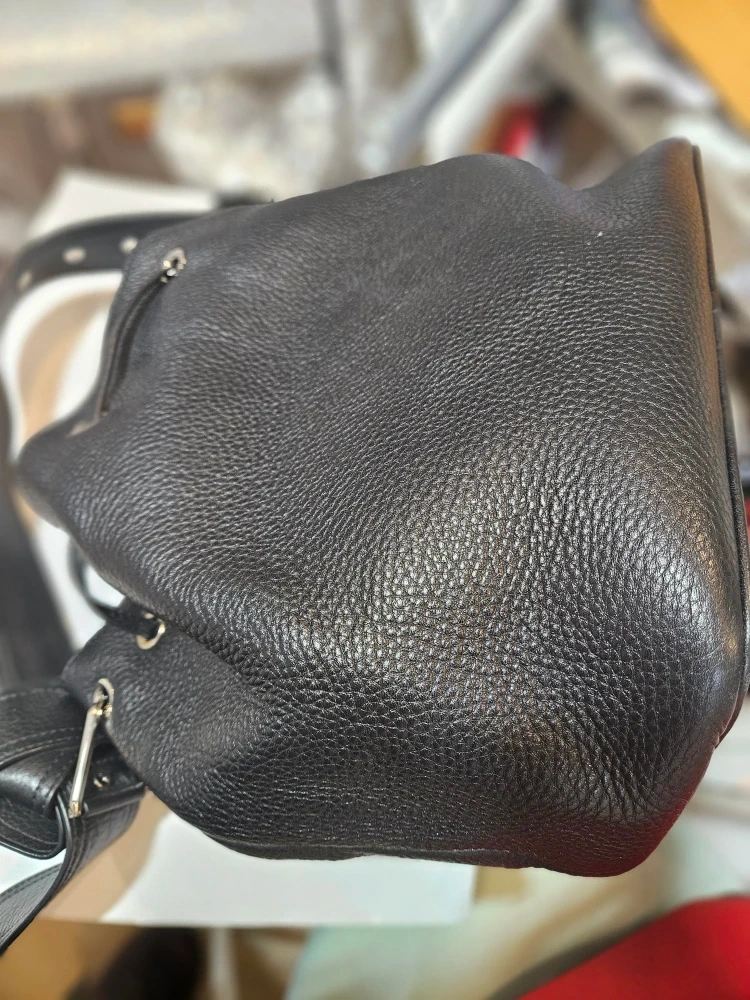 Selling a stylish black leather bucket bag from Max Mara. It's in great condition and perfect for everyday use! The bag features a drawstring closure and an adjustable shoulder strap. The interior is lined and includes a zippered pocket.