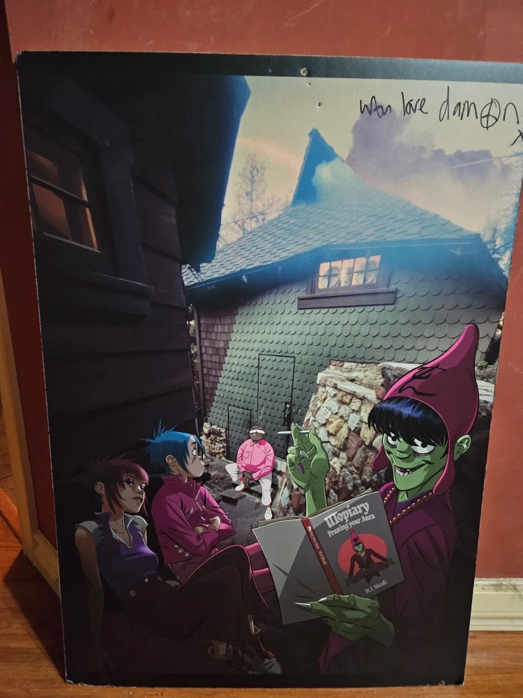 Selling a Gorillaz poster that's signed by Damon Albarn! It's in great shape and would be perfect for any fan of the band. It features the characters from the band reading a book called "Topiary: Pruning your Aura".