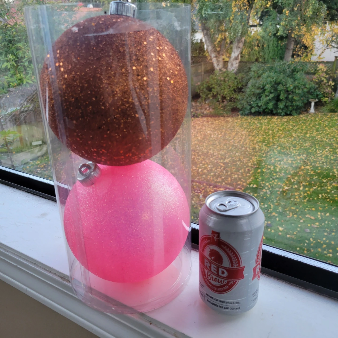 Selling two extra large Christmas ornaments, one pink and one gold. Both have 6" in diameter are covered in glitter and come in a clear plastic container. They're perfect for adding some sparkle to your Christmas tree or any other party with the non xmas traditional color of gold and pink