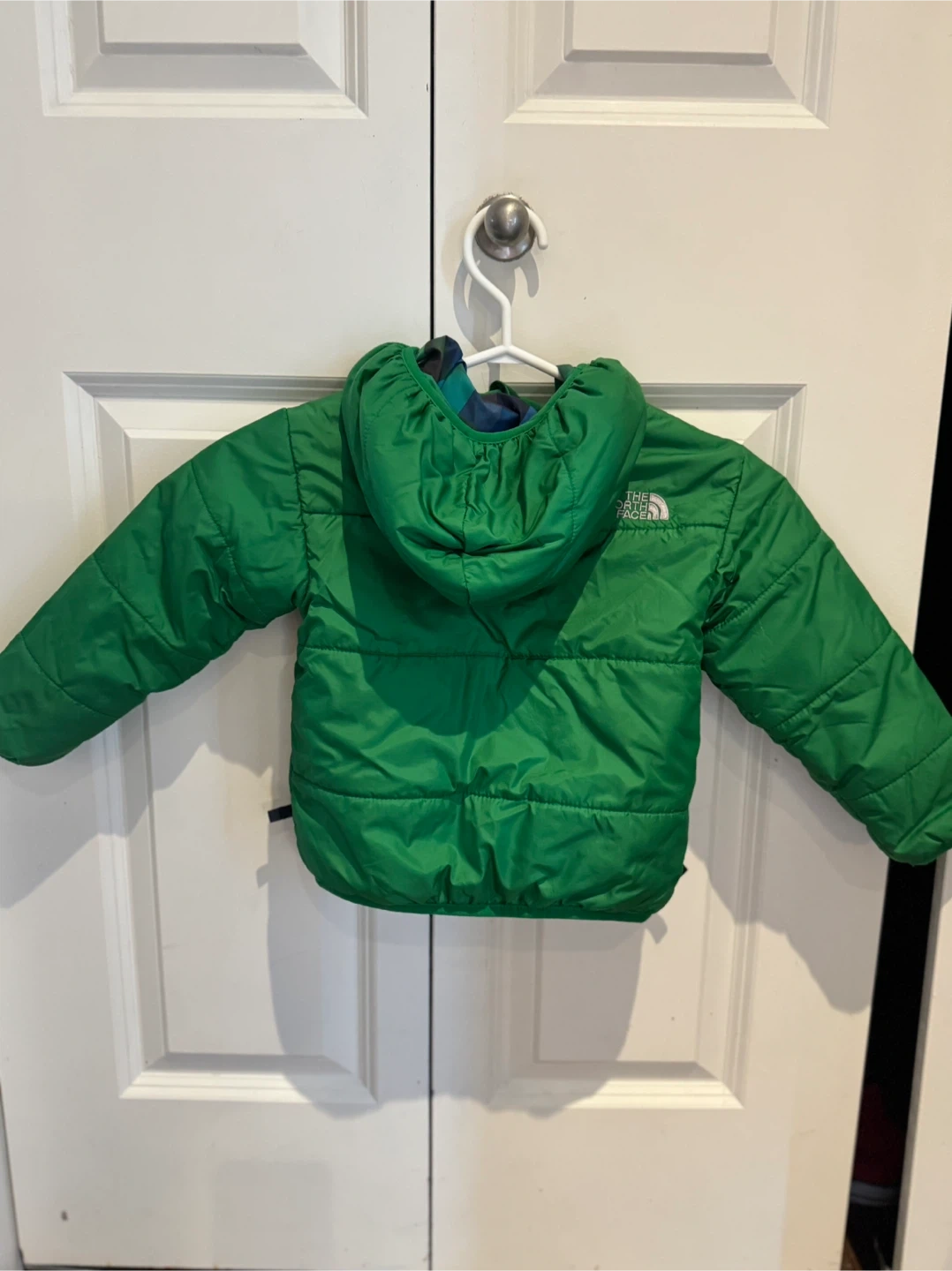 Here's a cozy The North Face toddler jacket in size 3T! It's a vibrant green colour on one side, and a fun blue and green plaid pattern on the other. Perfect for keeping your little one warm and stylish! Pick up heritage pointe golf course area