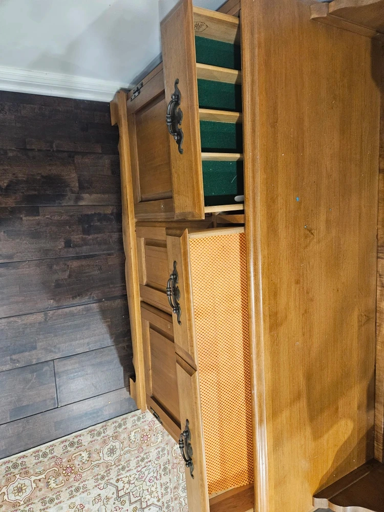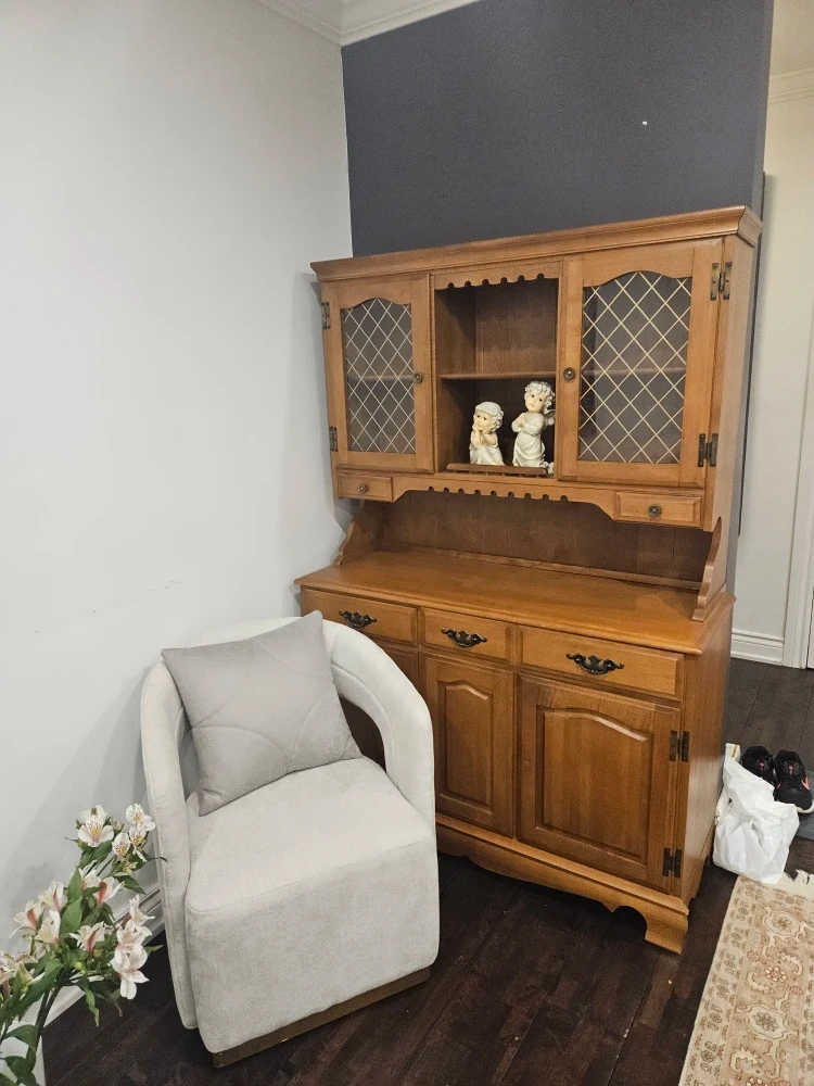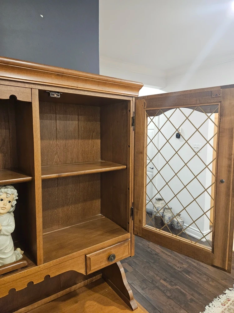 Selling a vintage real wood hutch. This piece has a classic design with glass-paneled doors and ample storage space. It would be a great addition to any dining room or living room!