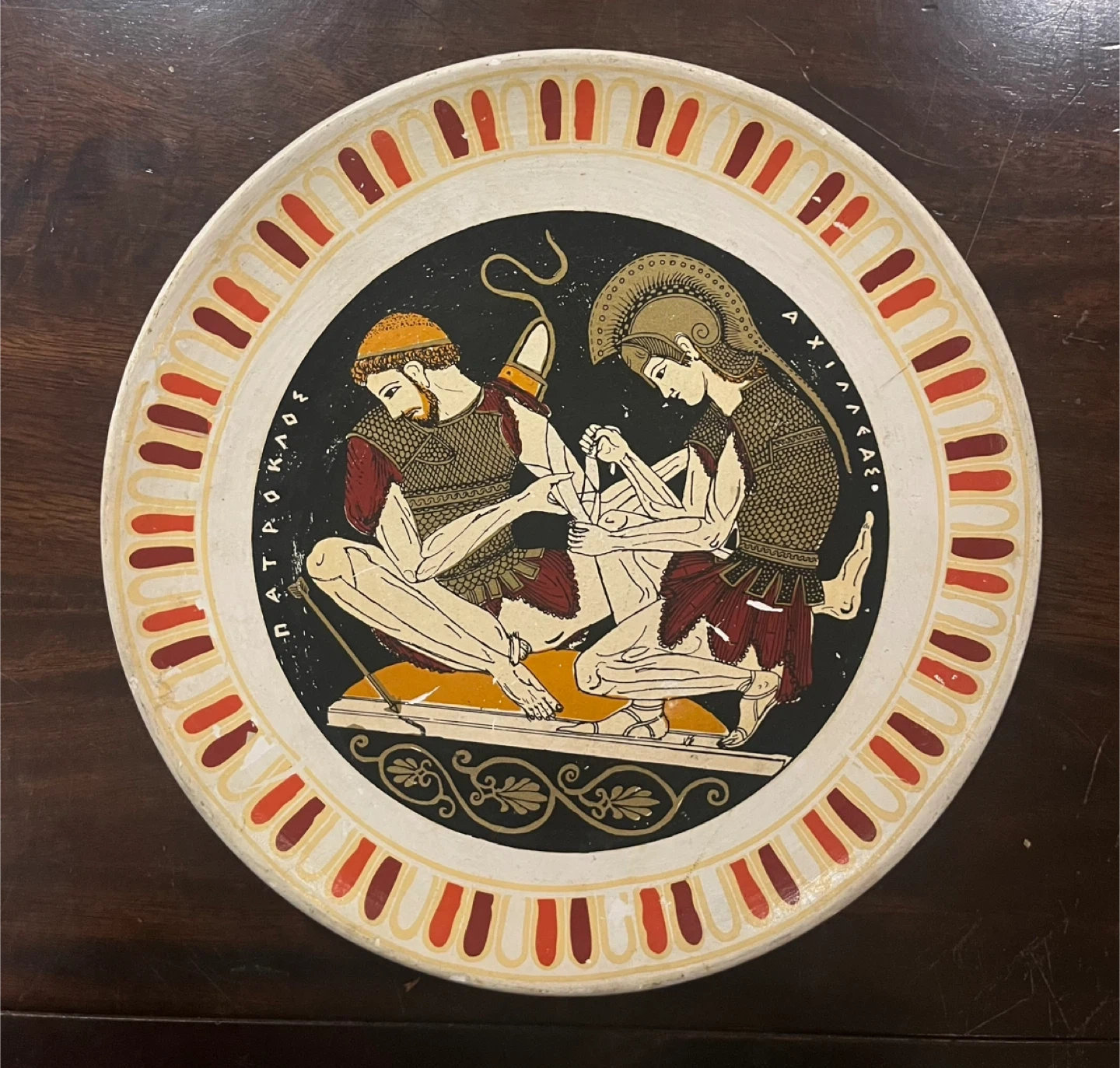 The plate is a reproduction of a famous depiction found on a 500 BCE kylix (drinking cup) created by the Sosias Painter, currently housed in Berlin's Antikensammlung museum. It has a hook to be hung on a wall.