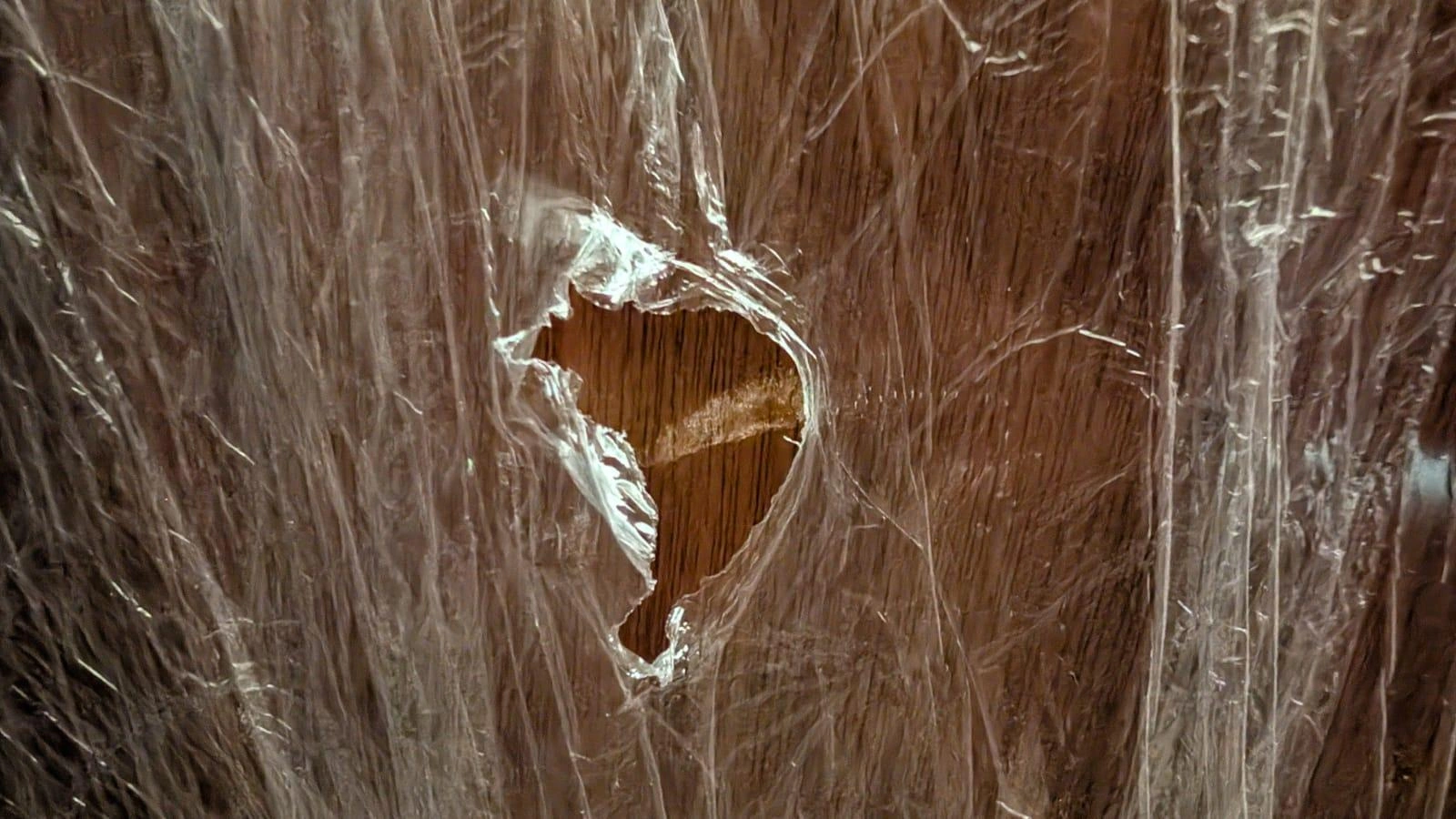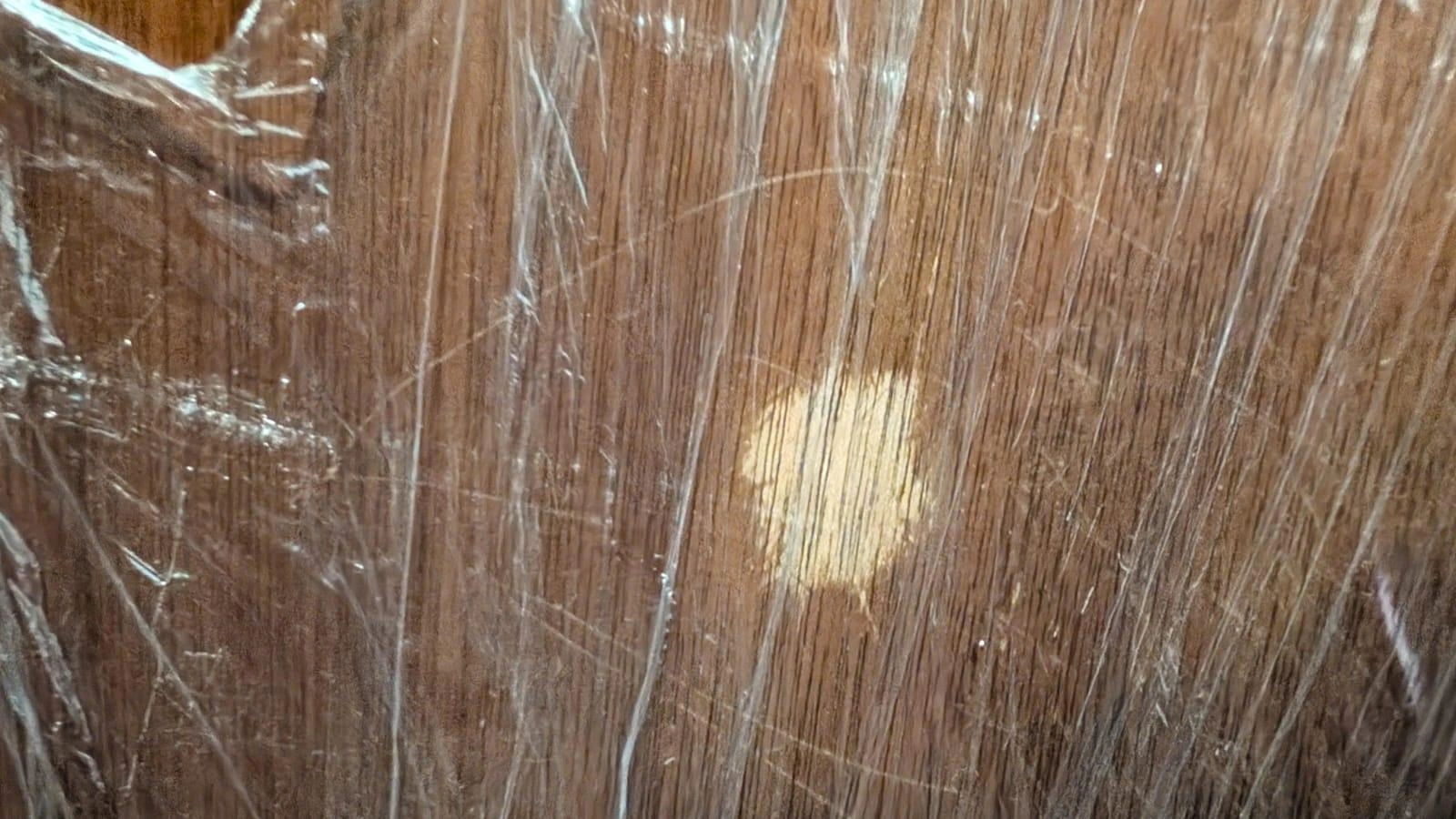 It has been in storage and wrapped up. There is 1 discolouration spot, a scratch and 1 scuffed spot on the top of the table.
