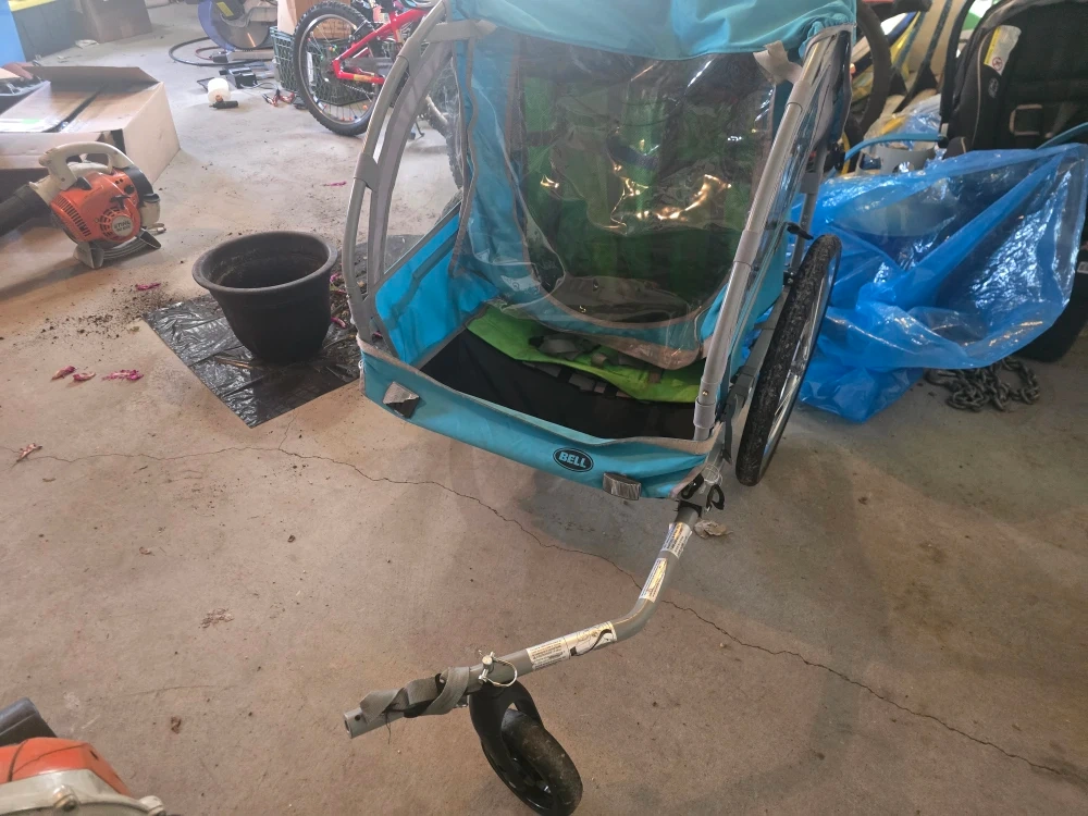 Selling a Bell child bike trailer in blue! It's perfect for taking your little ones along for a ride. Its in great condition and ready for new adventures! Connects to a bike but can also use the wheel to turn it into a stroller, shown in the pictures.
