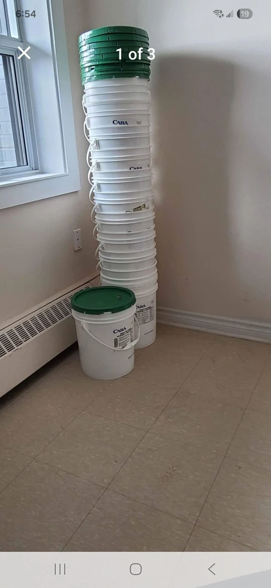 Selling Cara Cornichons bucket. 19 liter food grade buckets with lids have been washed and cleaned. Mouth 11.50",tall 14",bottom 10.5" I have total 5 buckets.