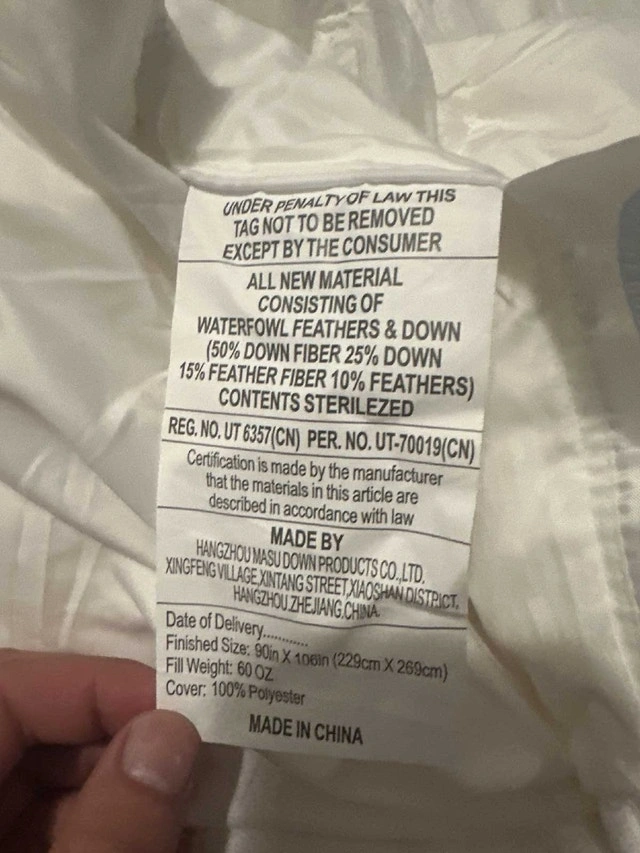 New (Open Box) duvet. Box opened but item unused — tested! Soft Organic Cotton Comfort: Made from 100% OCS-certified organic cotton, this California King duvet features a breathable, skin-friendly, noise-free shell that gently envelops the body for deeper, uninterrupted sleep. Ideal for users with sensitive skin or allergies. Premium Warmth & Lightweight Loft: Filled with 65 oz of responsibly sourced down feather fibers, offering high loft and exceptional warmth without unnecessary bulk. Completely odorless with a cloud-like feel that enhances comfort every night. All-Season Performance: Balanced for year-round use, providing cozy insulation during winter and cool breathability in warmer months. Designed to deliver a luxurious, hotel-quality sleep experience across all seasons. Elegant, Durable Construction: Includes a 3D baffle-box design for even fill distribution and long-lasting loft. Anti-leakage fabric prevents shifting or shedding, while double-stitched piping adds strength. Eight corner tabs keep the duvet securely anchored inside any cover. Care & Use Instructions: Comes vacuum-sealed—allow several days to fully expand or place in a dryer on low for 10 minutes to restore loft. For cleaning, spot clean or dry clean only. If spills occur, gently hand wash the affected area with warm soapy water and line-dry in shade.