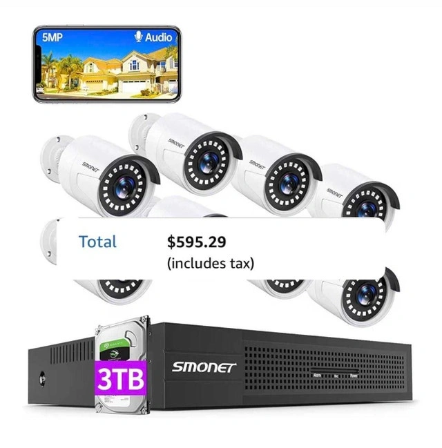 SMONET 8-Channel 5MP POE Security Camera System with 3TB HDD, Night Vision. New (Open Box). Box opened but item unused — tested!