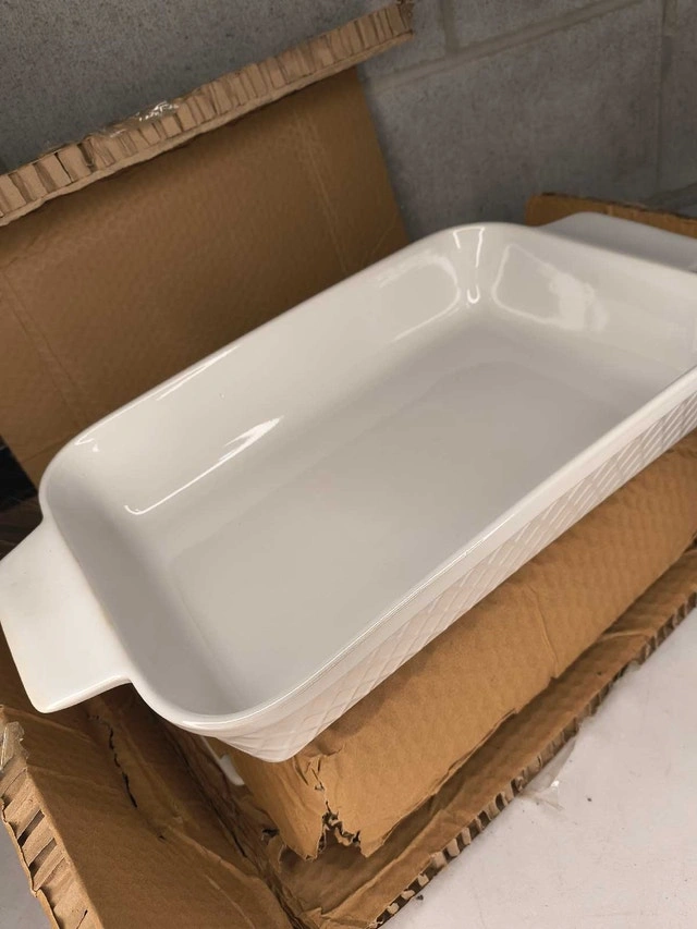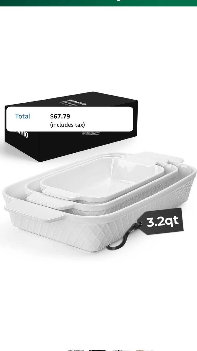 MIAMIO ceramic baking dish set includes three rectangular baking pans of different sizes. Mini baking dish 850 ml for single servings, small 1650 ml for two servings, and large 2900 ml for four or more servings. Designed for easy and space-saving storage. Each pan features a modern white Palmanova design with an elegant diamond pattern, matching other Palmanova items such as the plate set. Oven-safe stoneware is perfect for meat, casseroles, lasagna, and also suitable for non-oven uses like tiramisu preparation and serving. Food-safe coating, dishwasher-safe, microwave-safe, freezer-safe, and oven-safe for worry-free handling and easy cleaning. Securely packaged in a high-quality gift box. Ideal for housewarming, Easter, Christmas, Thanksgiving, Valentine's Day, and more. For Sale By: Owner