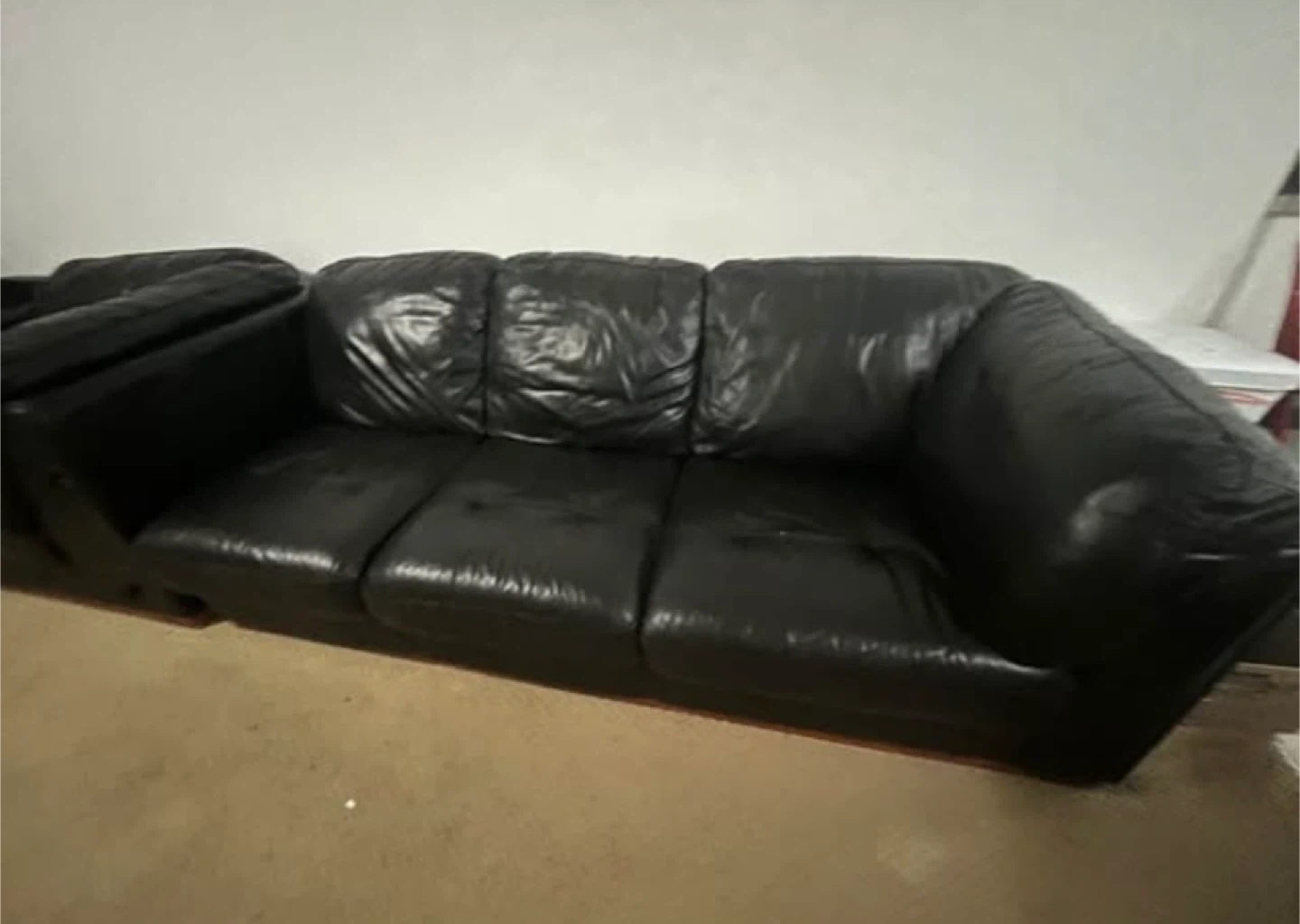 Comfy black leather sofa! It's in good condition and would be great for a living room or rec room. The material is leather, and it's a stylish piece of furniture