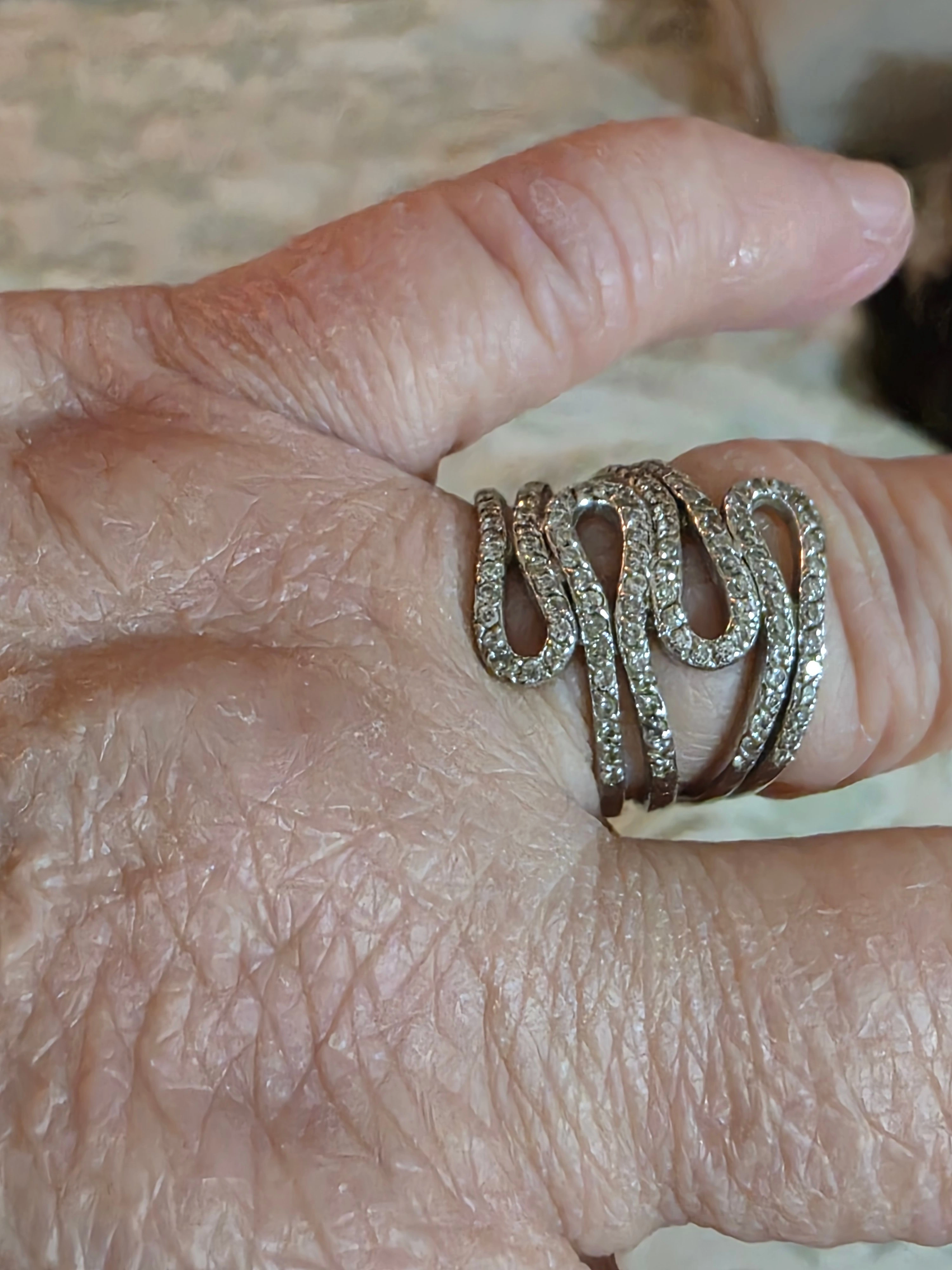This is a beautiful silver-tone ring with rhinestone detailing. It's in great condition and ready to add some sparkle to your outfit!