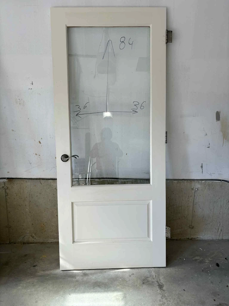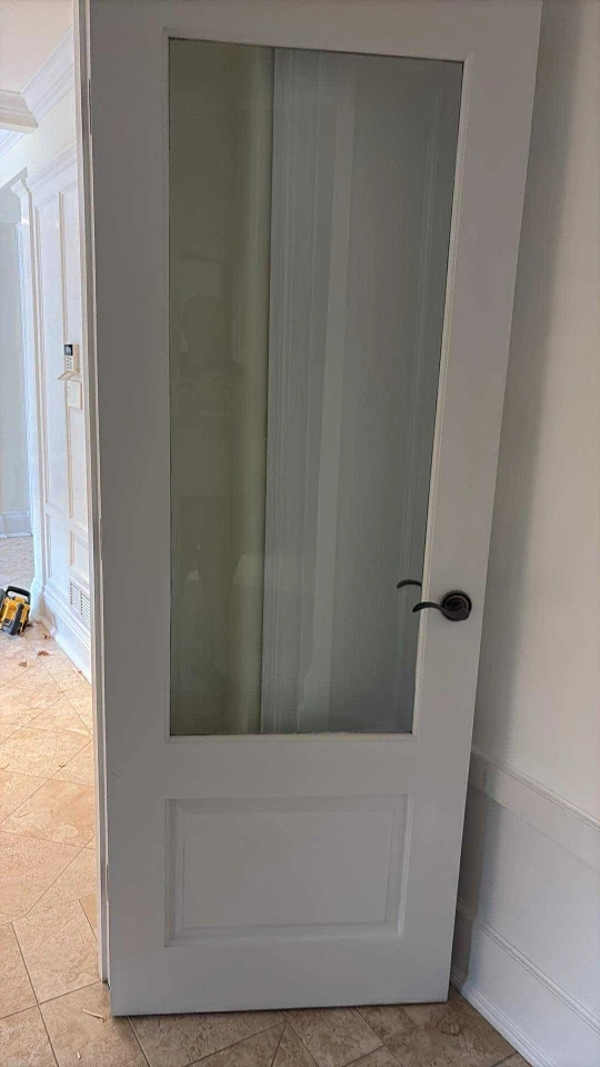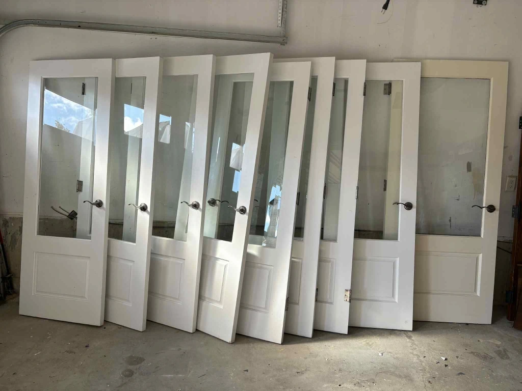 Selling a set of white solid wood interior doors, each featuring a glass panel. They come with a handle installed. Great for adding a touch of elegance to any room!