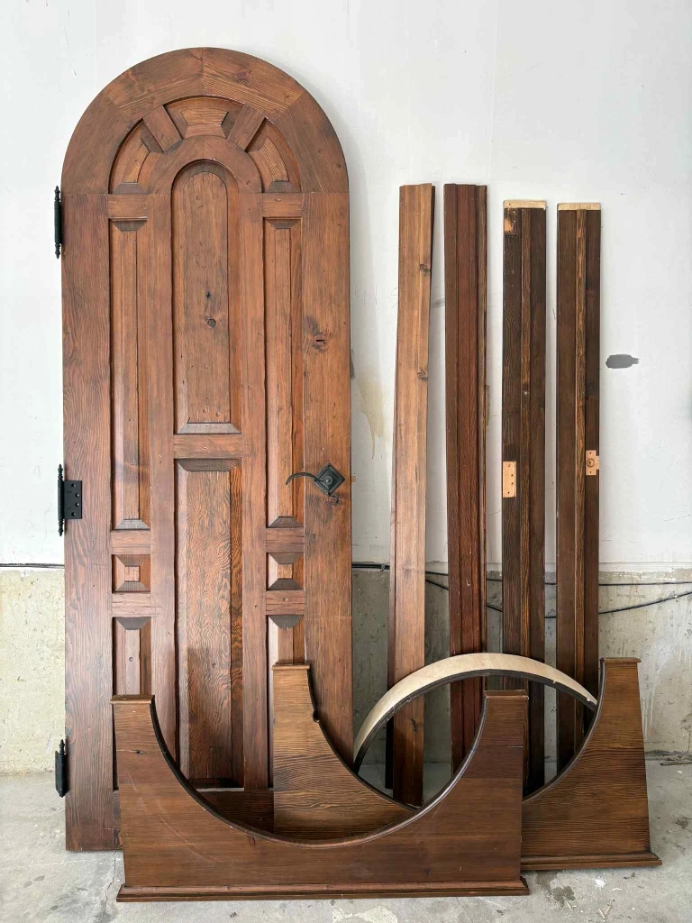 Selling a rustic arched wood door. The dimensions are approximately 30 inches wide and 83 inches tall. It has a beautiful, unique design that would add character to any space. Similar listed on Etsy for CA$4,314.76.