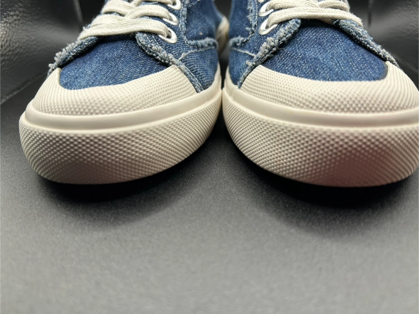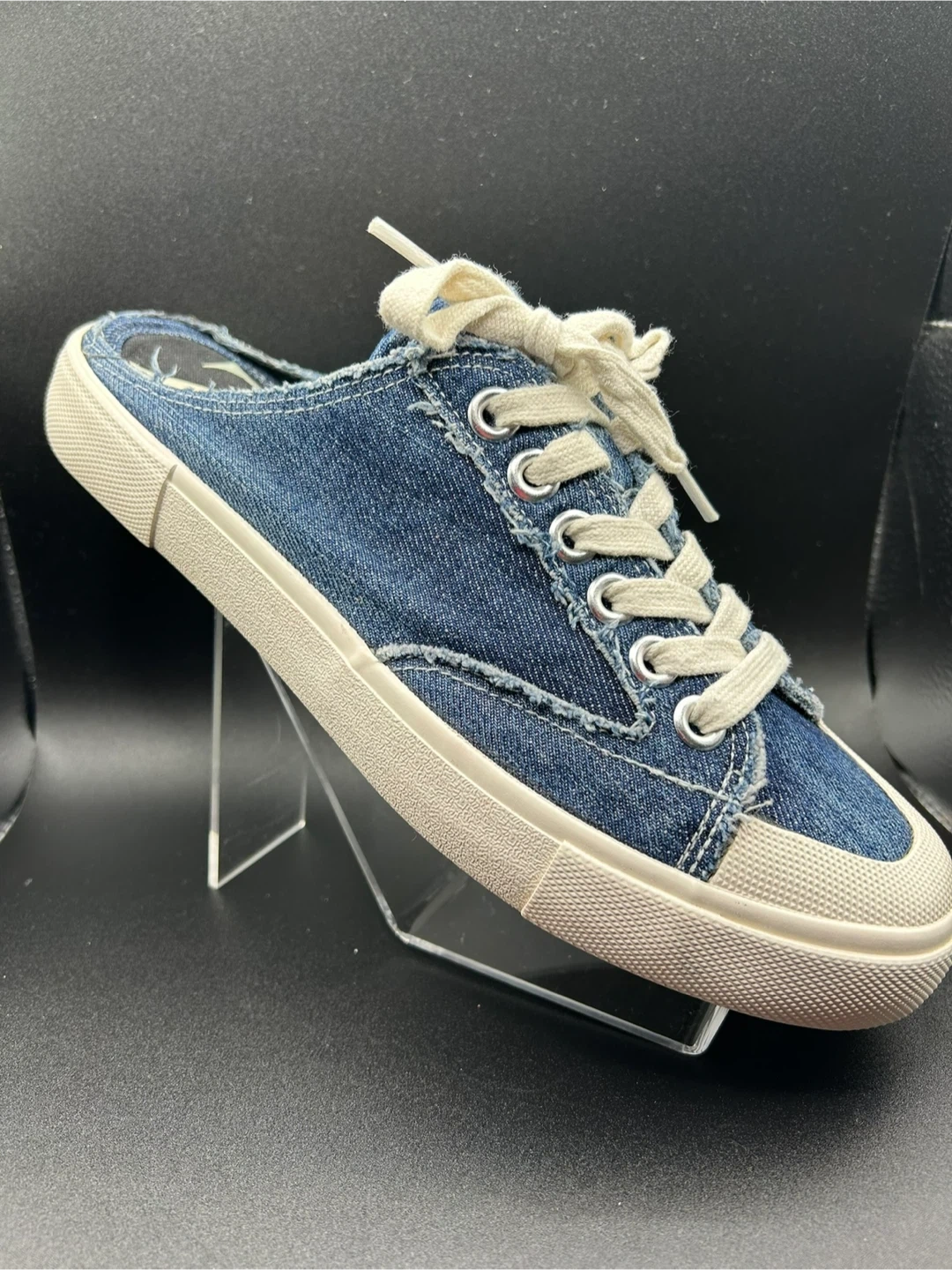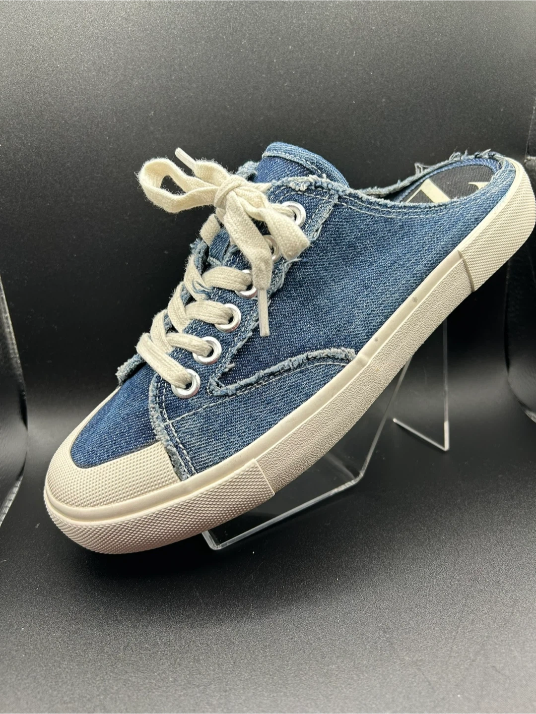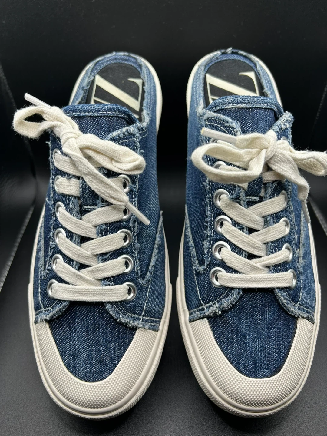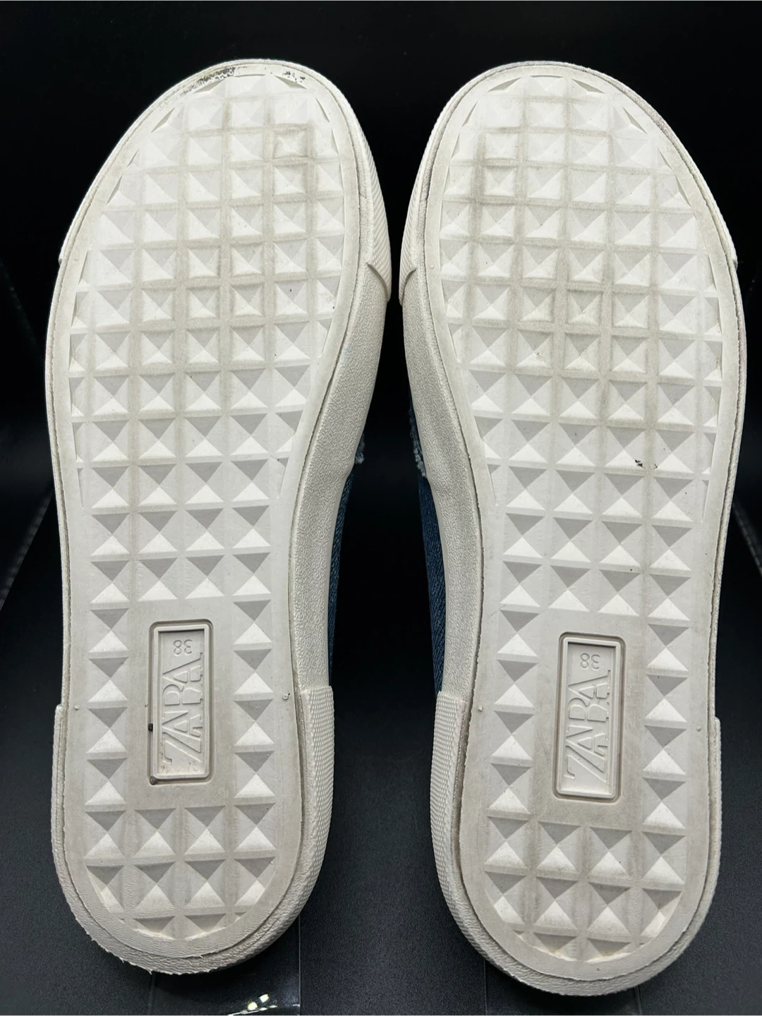 These are a pair of Zara denim mule sneakers. They feature a blue denim upper, white laces, and a white rubber sole. They're in good condition and ready for a new home!