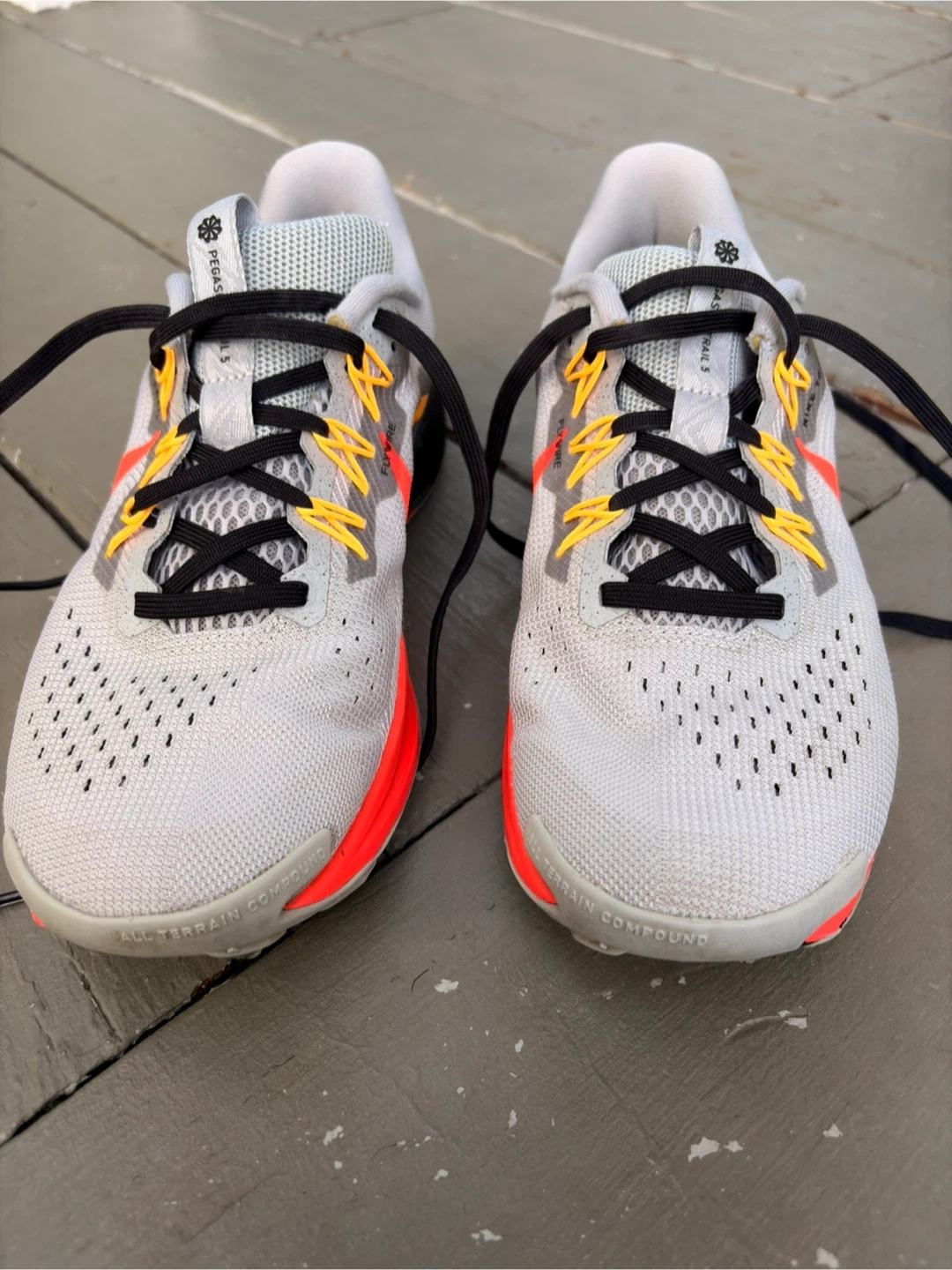 Selling a pair of Nike Pegasus Trail 3 shoes in men's size 10 US. They're in nearly new shape and ready for your next trail run! The shoes feature a gray and orange color scheme with black laces. Perfect for all-terrain adventures!