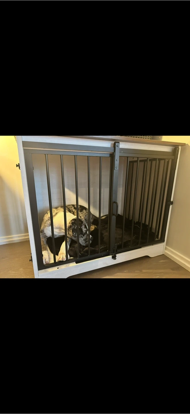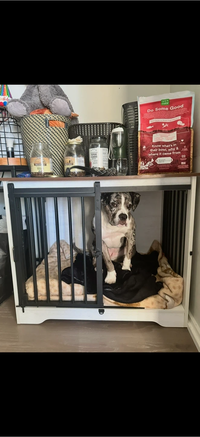 This is a dog crate that doubles as a stylish end table! The crate has a sturdy construction with a metal gate and a solid wood top. It's in great condition and ready for a new home!