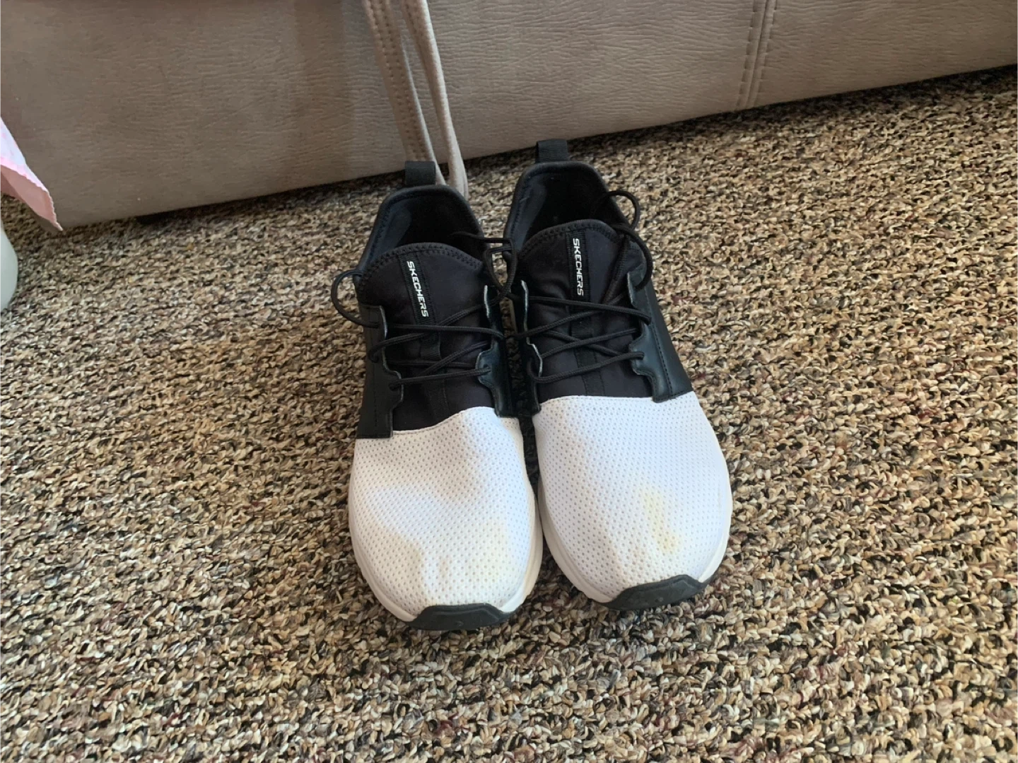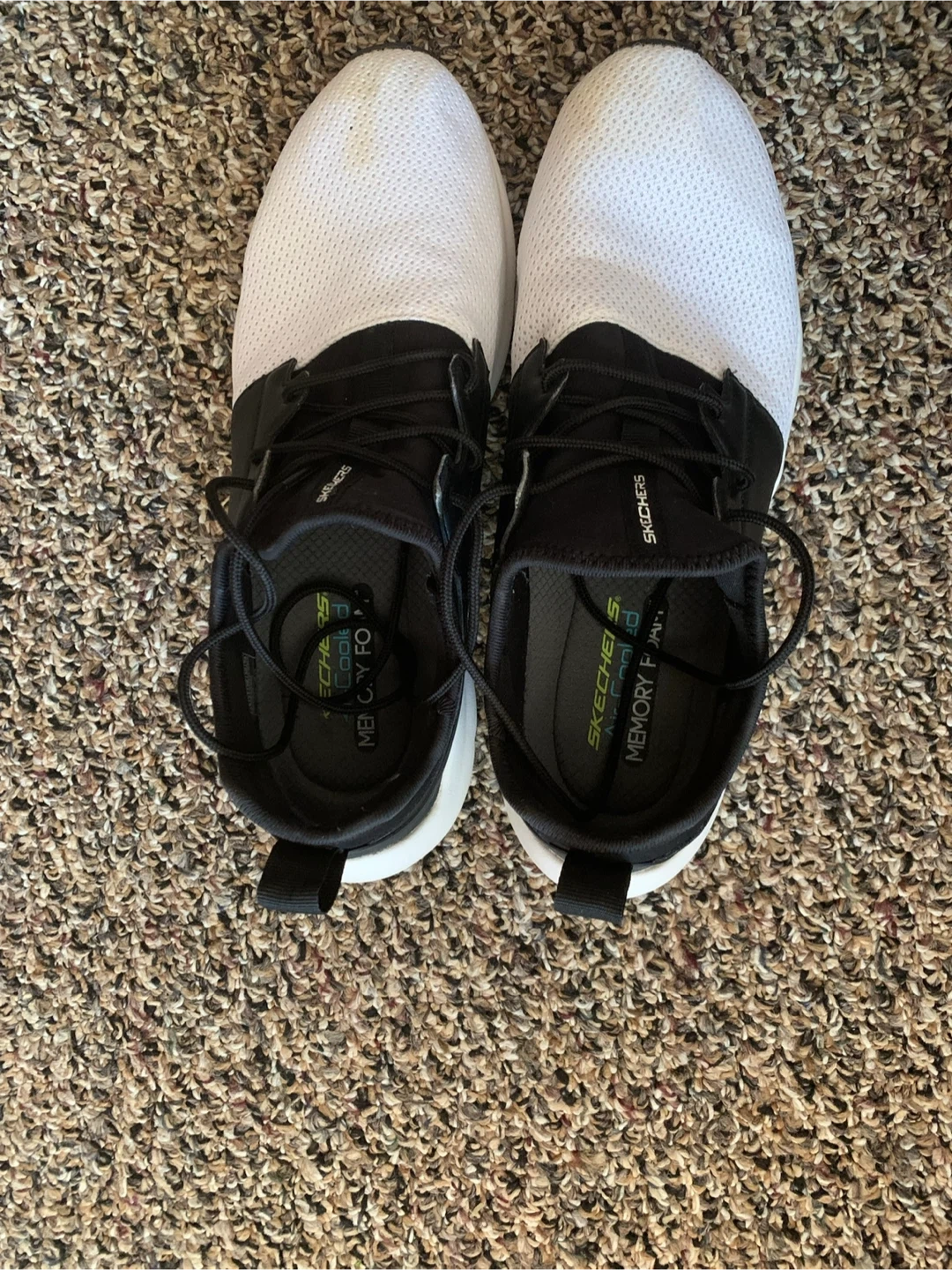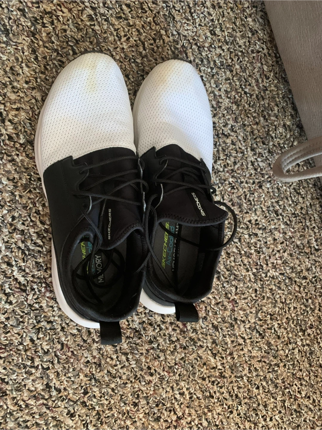 Selling a pair of Skechers Memory Foam shoes in US size 12. They have a stylish black and white design. Great for everyday wear!