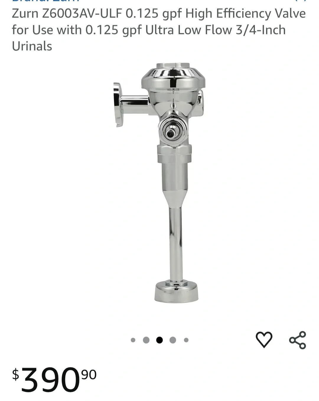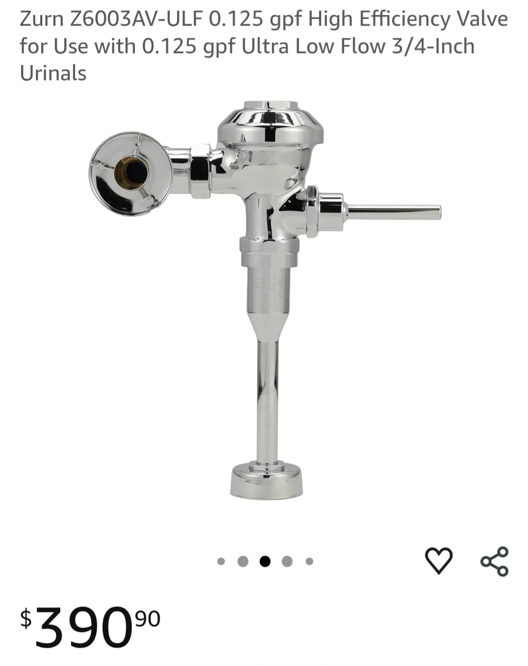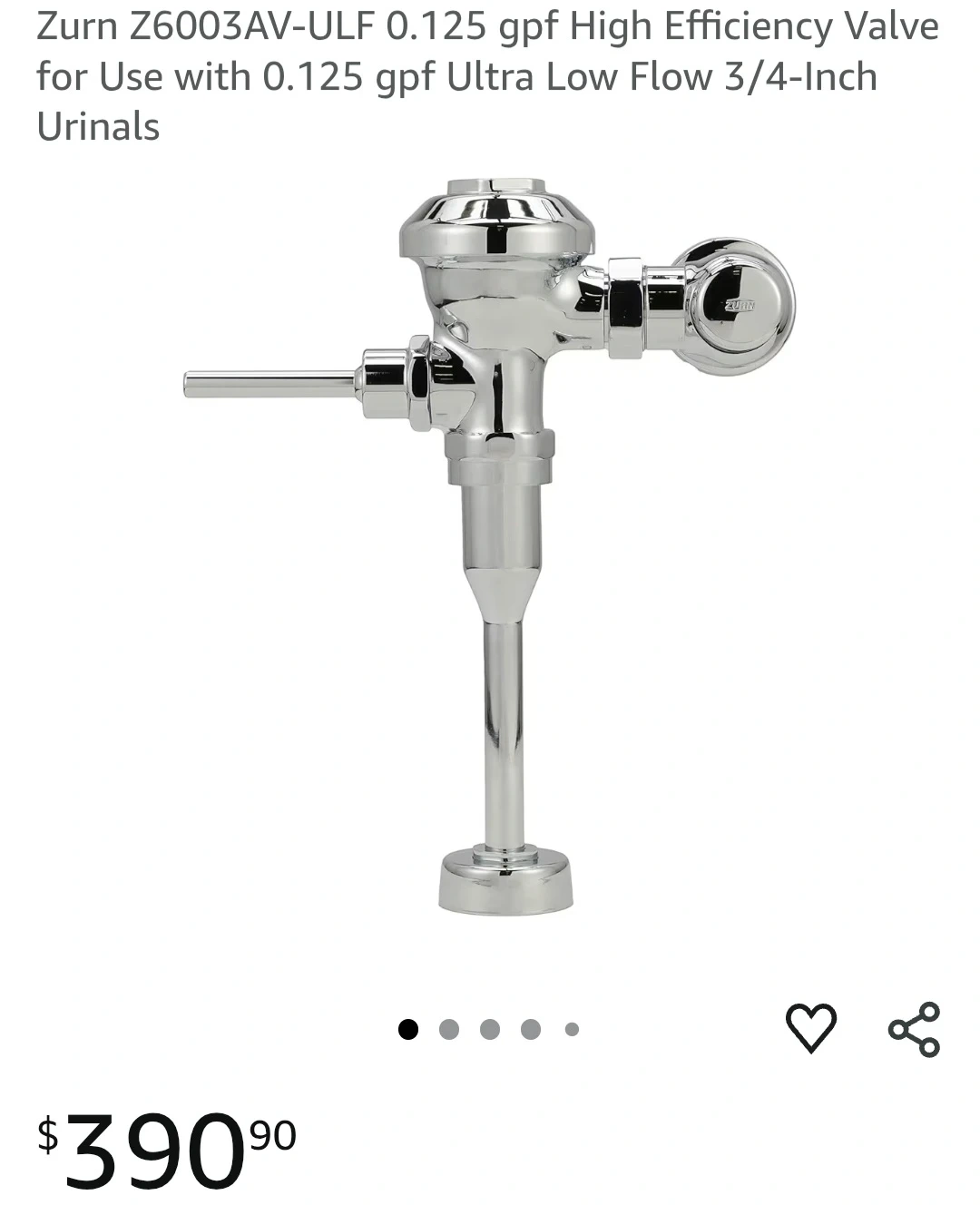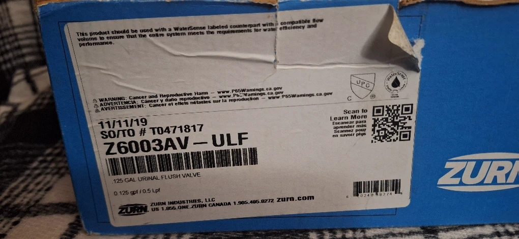 BRAND NEW OPEN BOX!!! Zurn Z6003AV-ULF 0.125 gpf High Efficiency Valve for Use with 0.125 gpf Ultra Low Flow 3/4-Inch Urinals MaterialOther BrandZurn Item dimensions L x W x H5.7 x 12.1 x 29.2 Centimetres Exterior finishChrome Inlet connection size0.75 Inches Inlet connection typeFlange Manual Flush Valves Clog-resistant triple filter diaphragm Chemical resistant gaskets and seals for extended service life with lower maintenance costs Manual ADA compliant handle with no-leak seal technology Condition brand new never used Pick up only $300
