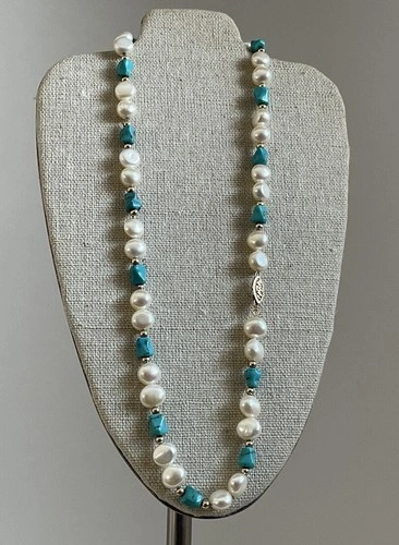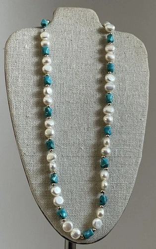 BEAUTIFUL TURQUOISE & NATURAL WHITE PEARL NECKLACE WITH GOLD SPACER BEADS & 14K GOLD CLASP. IN EXCELLENT CONDITION. The Necklace is 16 inches long and is marked on the clasp.