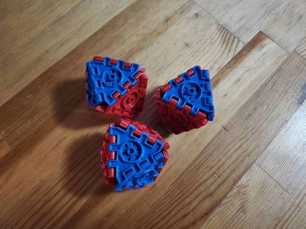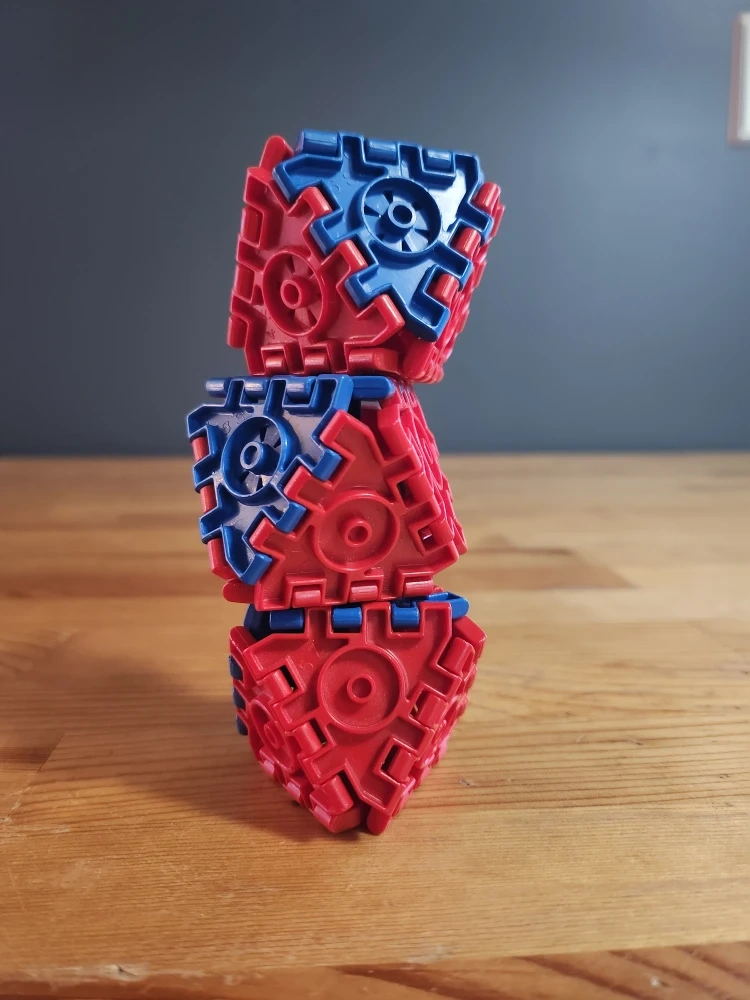 Set of 3 Polyhedron interlocking red/blue blocks. These toys are designed for stress relief and mindful meditation.