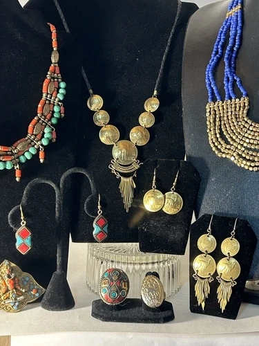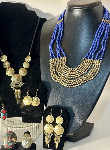 TRIBAL COLLECTION TIBETAN VINTAGE JEWELRY LOT. Includes: 3 Necklaces, 3 pairs of earrings (pierced), 2 rings (both are sizable) & 1 Brooch. All are in very good wearable condition. If you have any questions please ask. Thank you.