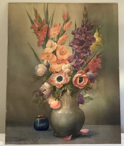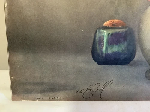 “GLADIOLI” ARTIST W.E. POWELL (1878-1955) RARE VINTAGE 1937 ART DECO FLORAL COLOR LITHOGRAPH ART PRINT. A SPECIAL PIECE TO ADD TO YOUR COLLECTION. FEATURING A COLOR IMAGE OF AN ORIGINAL FLORAL STILL LIFE PAINTING. MEASURES 20”H x 16”W. IN GOOD CONDITION - WEAR IS CONSISTENT WITH AGE. PLEASE SEE PHOTOS FOR CONDITION REFERENCE.