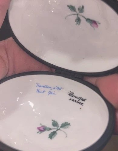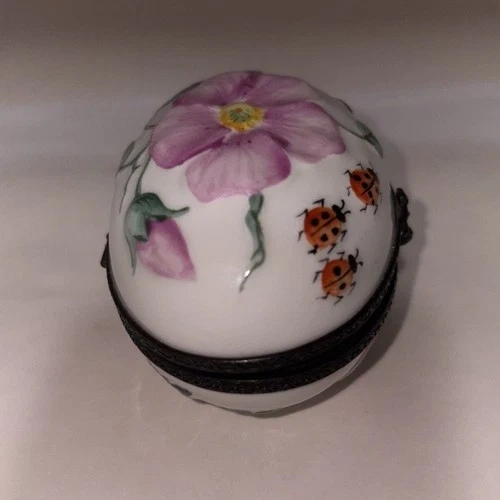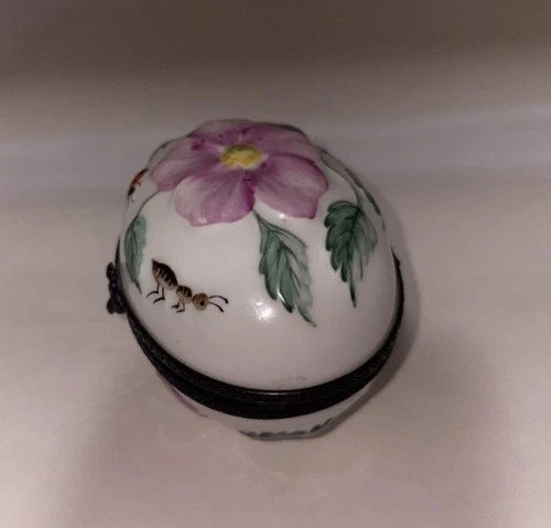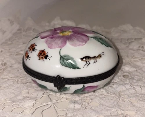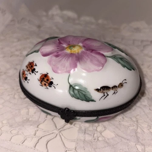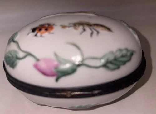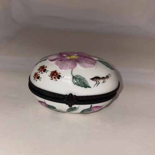 Experience the charm of vintage Limoges France with this delightful Hinged Trinket Box. Crafted from high-quality porcelain, this small, oval-shaped keepsake box is adorned with hand-painted details featuring lady bugs, ants, and flowers, creating a whimsical and delicate design that's both timeless and captivating. Measuring at 3 inches in length, the trinket box boasts a hand painted finish that accentuates its lovely pattern and ensures it stands out as a piece of artistry. It comes from a rich tradition of French craftsmanship, making it an ideal collectible or a thoughtful gift.