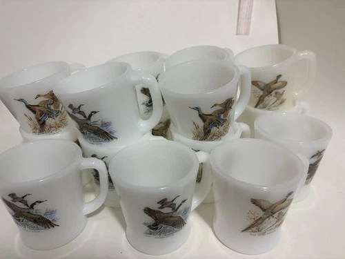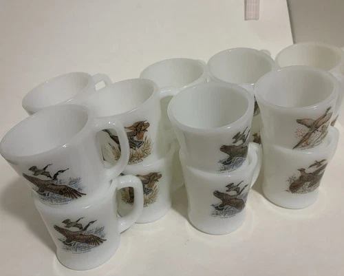 Add a touch of vintage charm to your mug collection with the Anchor Hocking's Fire-King line. Each mug features a water fowl pattern, elegantly rendered in a white milk glass that's sure to complement any kitchen décor. Crafted in the 1950s, these mugs are a nostalgic nod to a bygone era, perfect for all occasions. Available are: Canada Goose x3, Mallard Duck x6, Ring Necked Pheasant, x3, Ruffled Grouse x3. Variety and consistency in design, all with the quality craftsmanship Anchor Hocking is known for. Whether you're sipping your morning coffee or enjoying an evening tea, these mugs are a fine choice for anyone who appreciates the beauty of game bird motifs and the timeless appeal of vintage glassware. Purchase all or some 12.99 each or 179.00 for all 16.