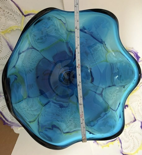 Vintage Viking Glass Epic Bluenique Compote Pedestal Bowl, a true gem from the Mid-Century Modern era. The bowl's striking blue hue and intricate 6-petal design reflect a time of artistic innovation and craftsmanship, making it a standout piece for any collection. The bowl weighs 620 g and measures 6.5 inches in diameter, resting on a pedestal that brings its height to 4 inches. Crafted through traditional hand-blown glass techniques, this authentic piece hails from America's renowned Viking Glass production line. It's not just a functional item but also a decorative piece that adds a touch of sophistication to your interior. Whether for special occasions or as an everyday statement, this compote and pedestal bowl serves as a versatile addition to your home, requiring only hand washing to maintain its vintage beauty.