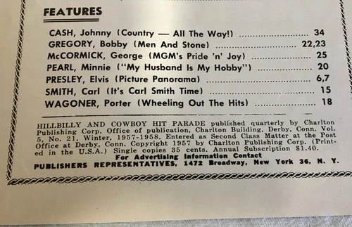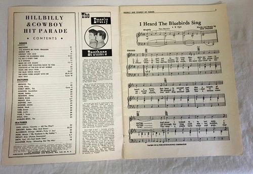 Hillbilly And Cowboy HIT PARADE 1957 Issue No 21. Complete words and music arranged for guitar, uke, banjo, piano, violin and voice as recorded by Hank Locklin, Carl Smith, Ray Price, The Browns, Johnny Horton plus Pictures and Stories from Favorite Stars like Elvis Presley, The Everly Brothers, Johnny Cash, Minnie Pearl and more. 36 page magazine is in good vintage condition ‘No major damage like tears holes or creases’ See photos.