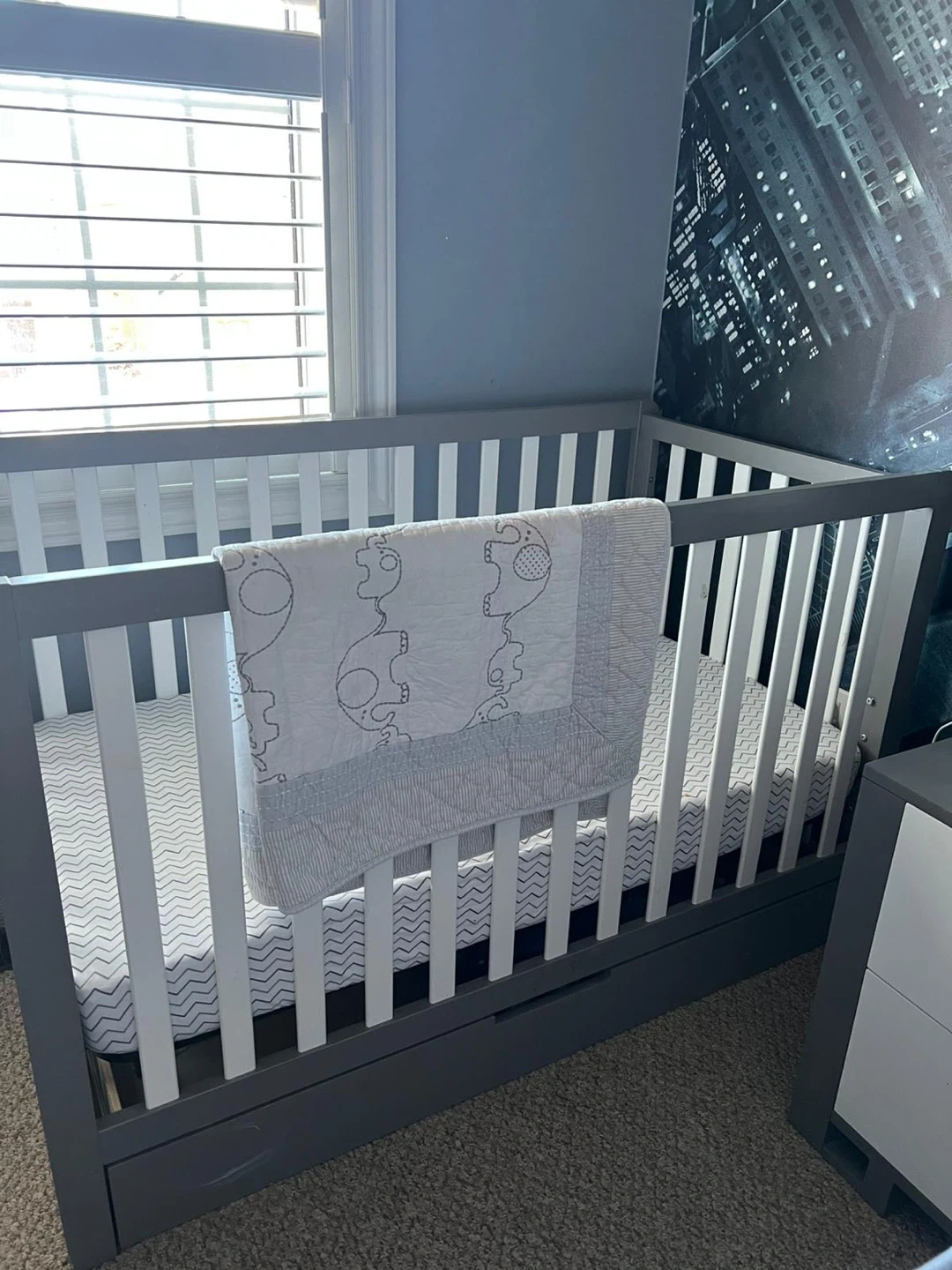 Selling a gently used baby crib (convertible) in great condition! It's a lovely grey colour and comes with a handy drawer underneath for extra storage. Perfect for your little one's nursery. Can be converted to bed.