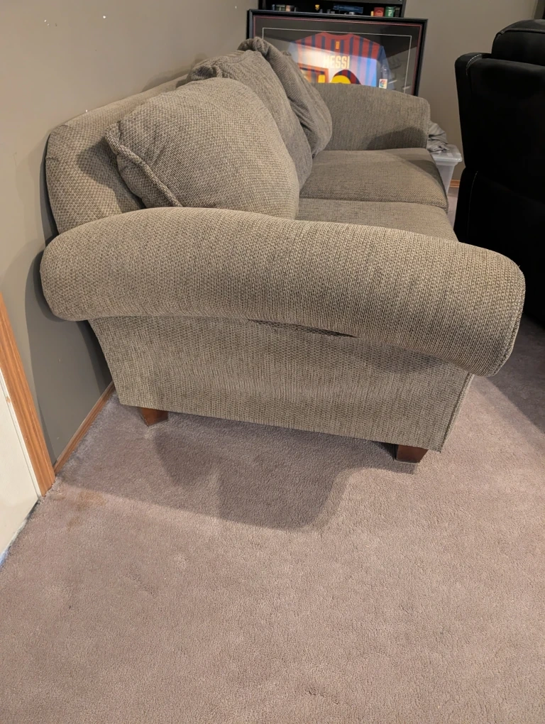 Neutral colour sofa will fit in with any decor. Older but in good shape. It is a Birchwood so the frame is solid and there is no sag on the cushions. No tears, Smoke and pet free home. Free but must be able to pick it up. Comes in one piece and will need 2 people to carry it. No delivery.