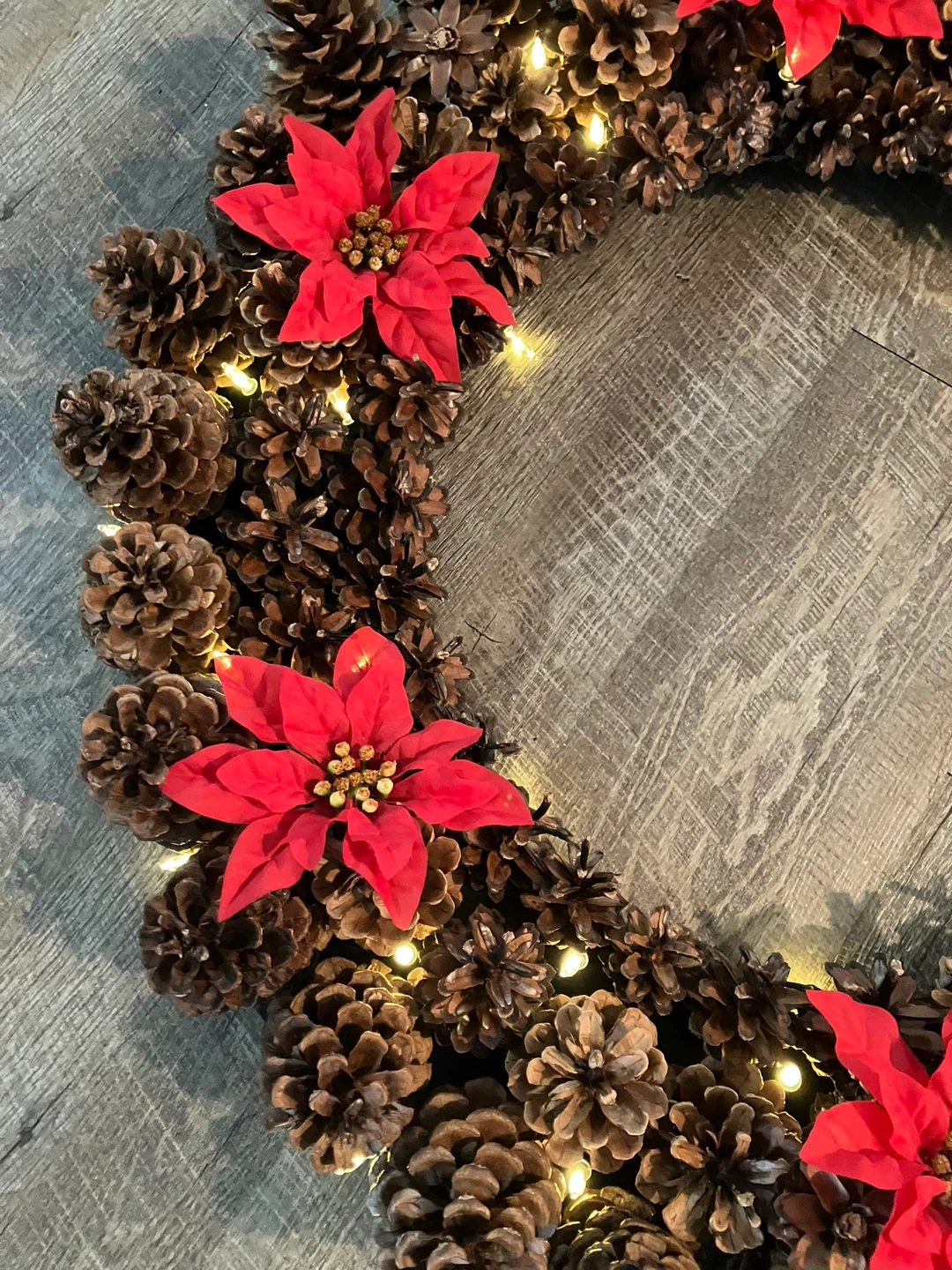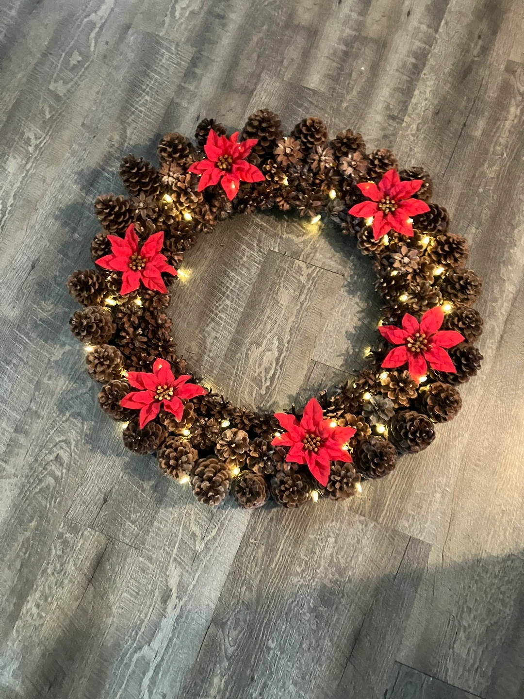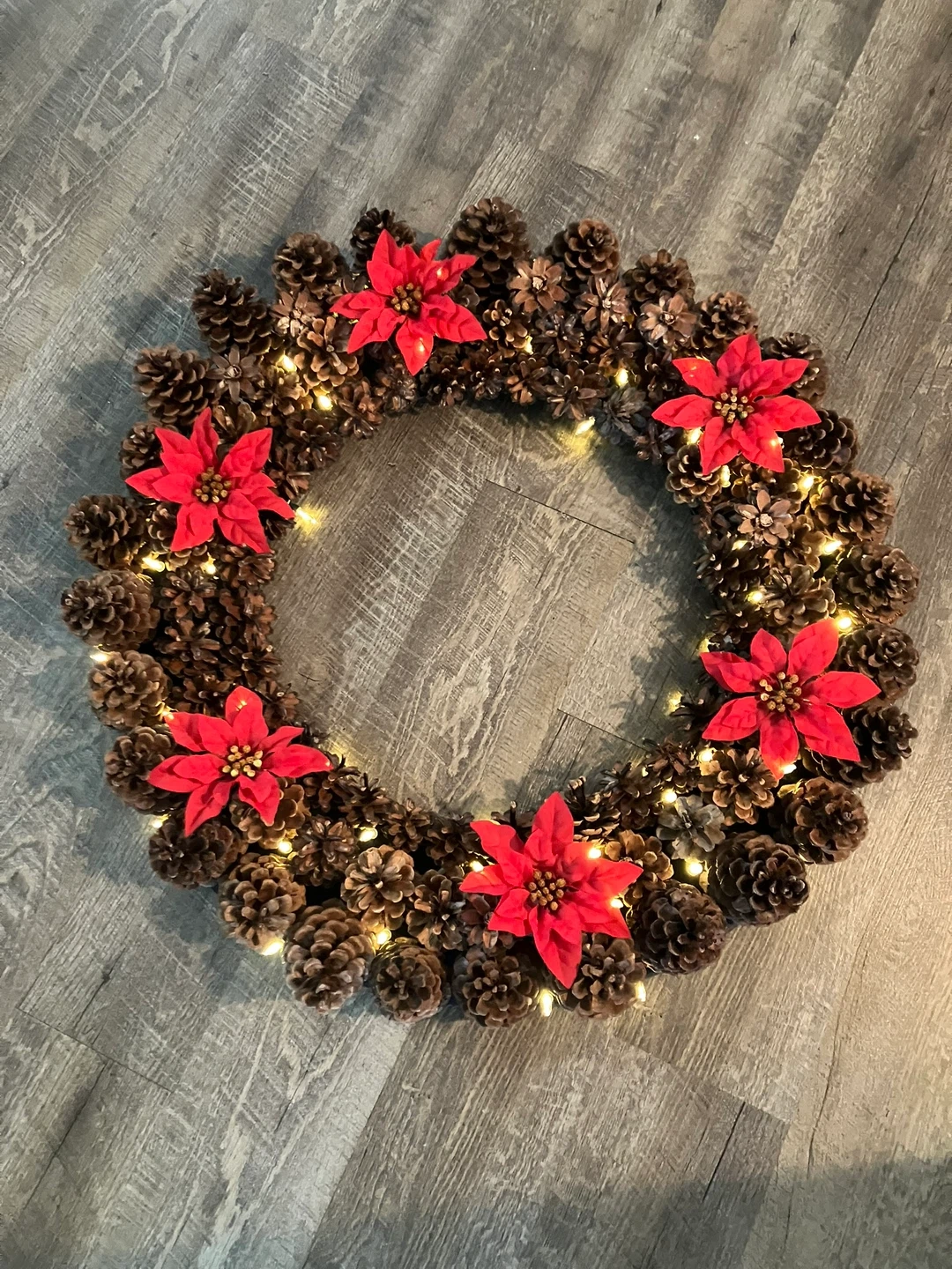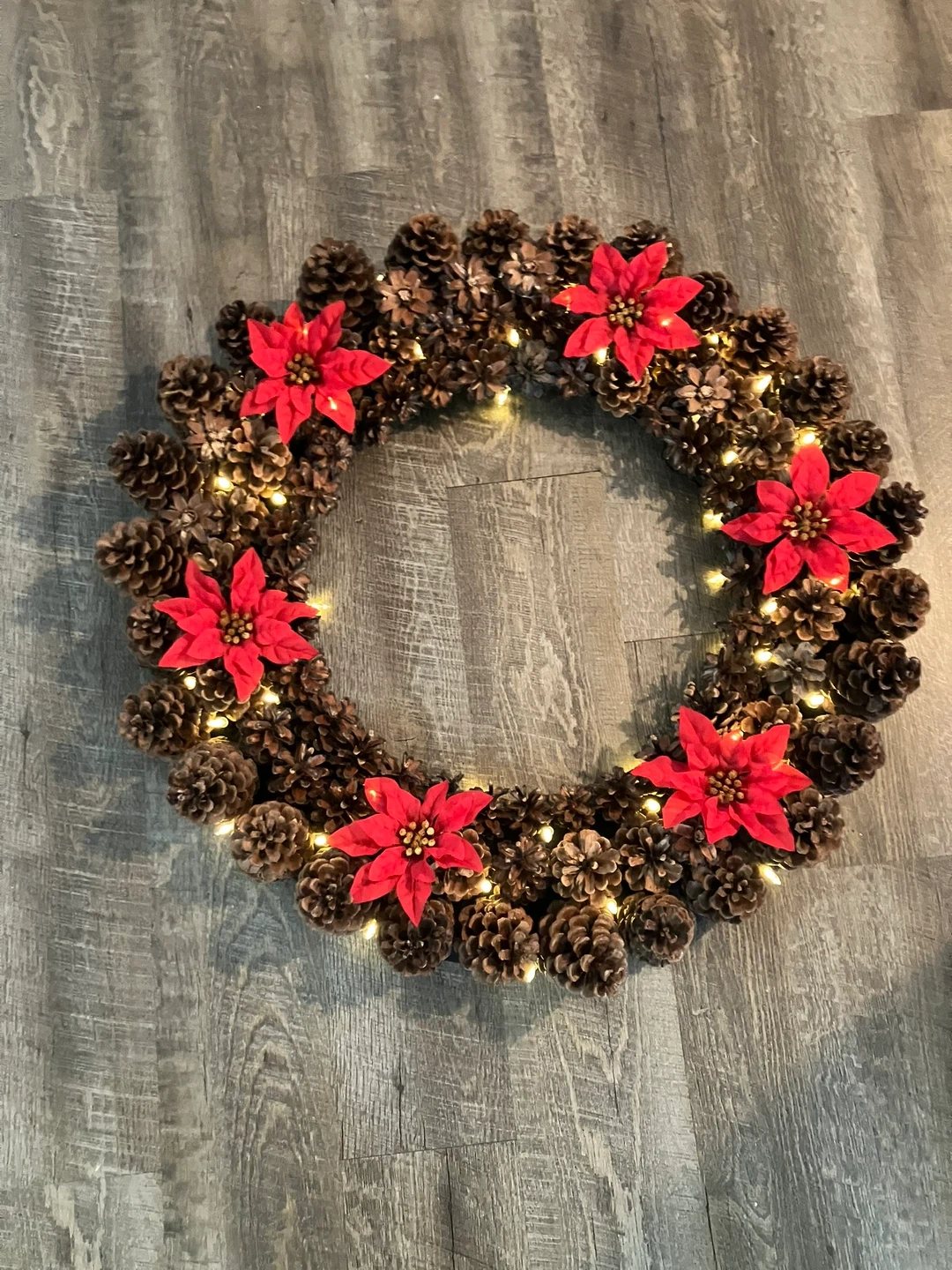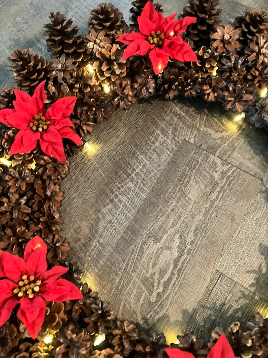 This is a lovely Christmas wreath made of pinecones and poinsettias. It would look great on your door or above your fireplace this holiday season!