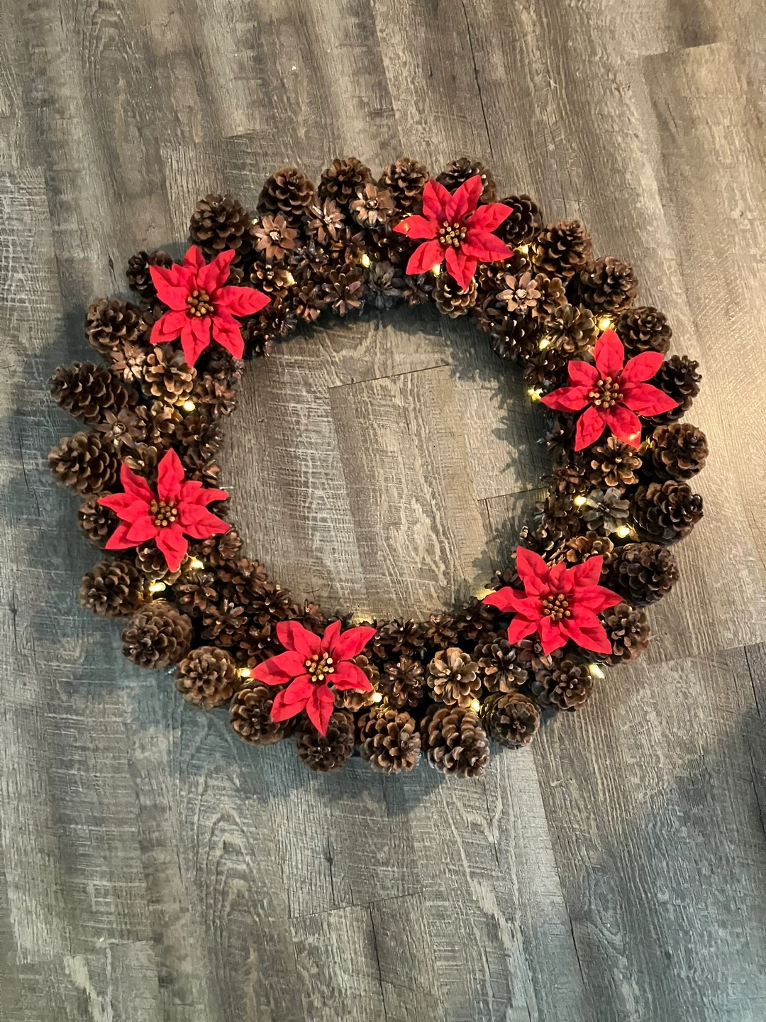 This is a lovely Christmas wreath made of pinecones and poinsettias. It would look great on your door or above your fireplace this holiday season!