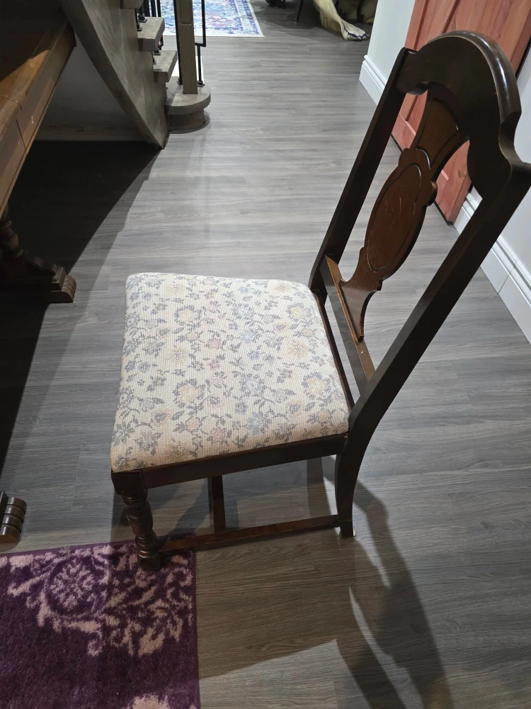 Antique table with leaf. Very old. Very well made. In great shape. Comes with a full set of antique dining room chairs. They have a unique design and would be a great addition to any home. The chair has a floral patterned seat and a dark wood finish