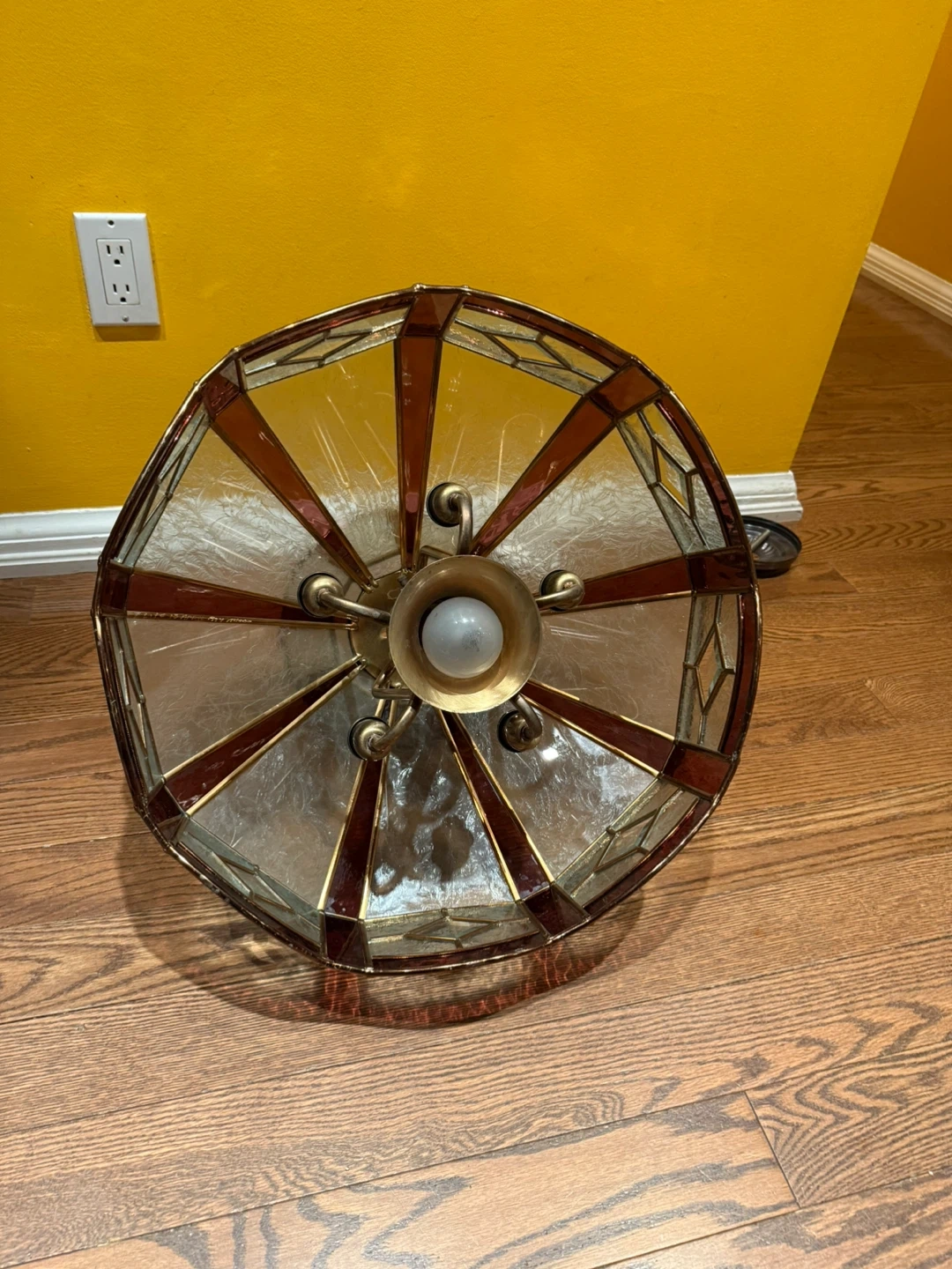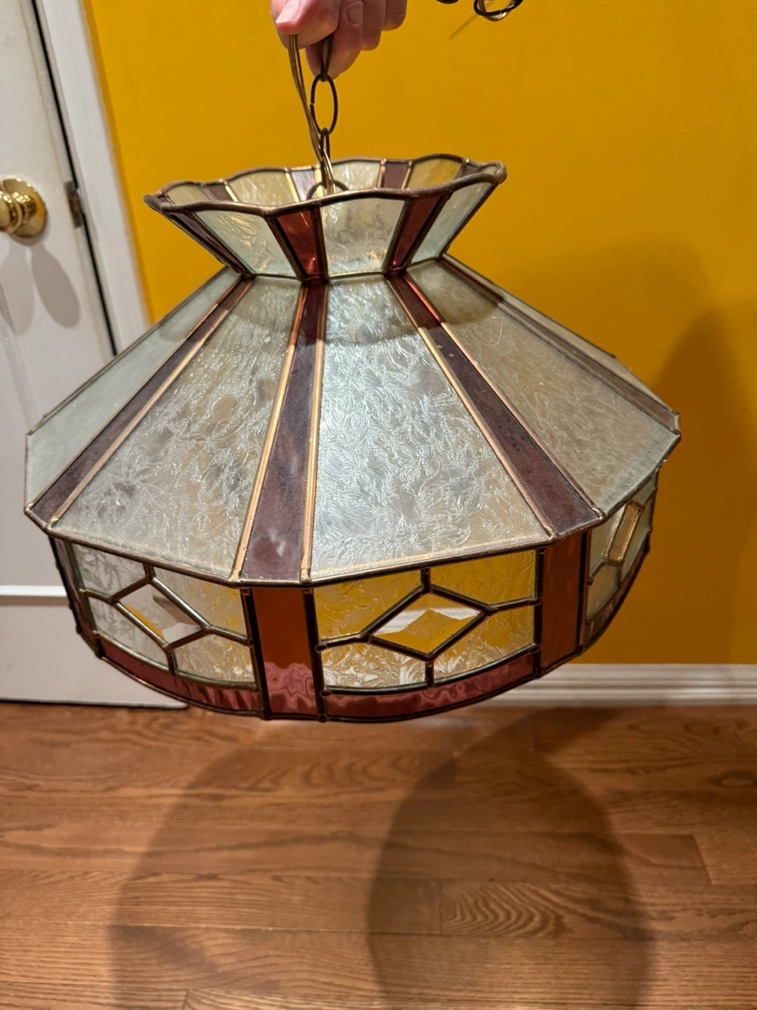 Selling a vintage stained glass hanging lamp. It has a warm, inviting glow and would be perfect for a dining room or living room. It features a geometric pattern with amber and clear glass panels. This is for a working vintage hanging light fixture. In very good condition for its age. Has a main down centred light and 5 arms for chandelier bulbs. Measures approximately 1 foot tall by 19” diameter.