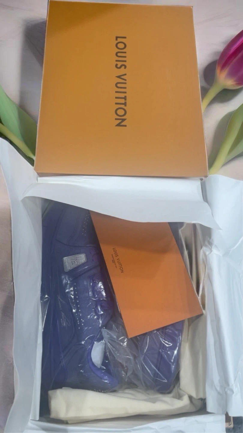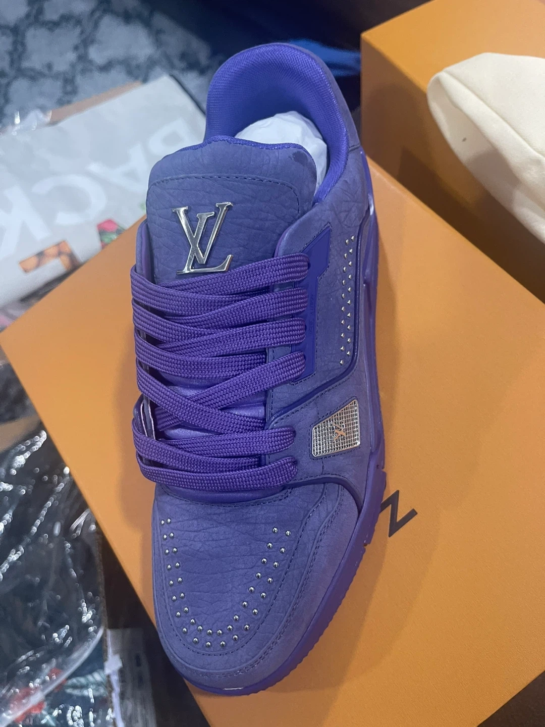 I'm selling a pair of Louis Vuitton sneakers in a beautiful purple color. These leather sneakers are in great condition and come with the original box! They feature the iconic LV logo and a stylish design. Perfect for adding a touch of luxury to your everyday look size 7, 8, 9, 11
